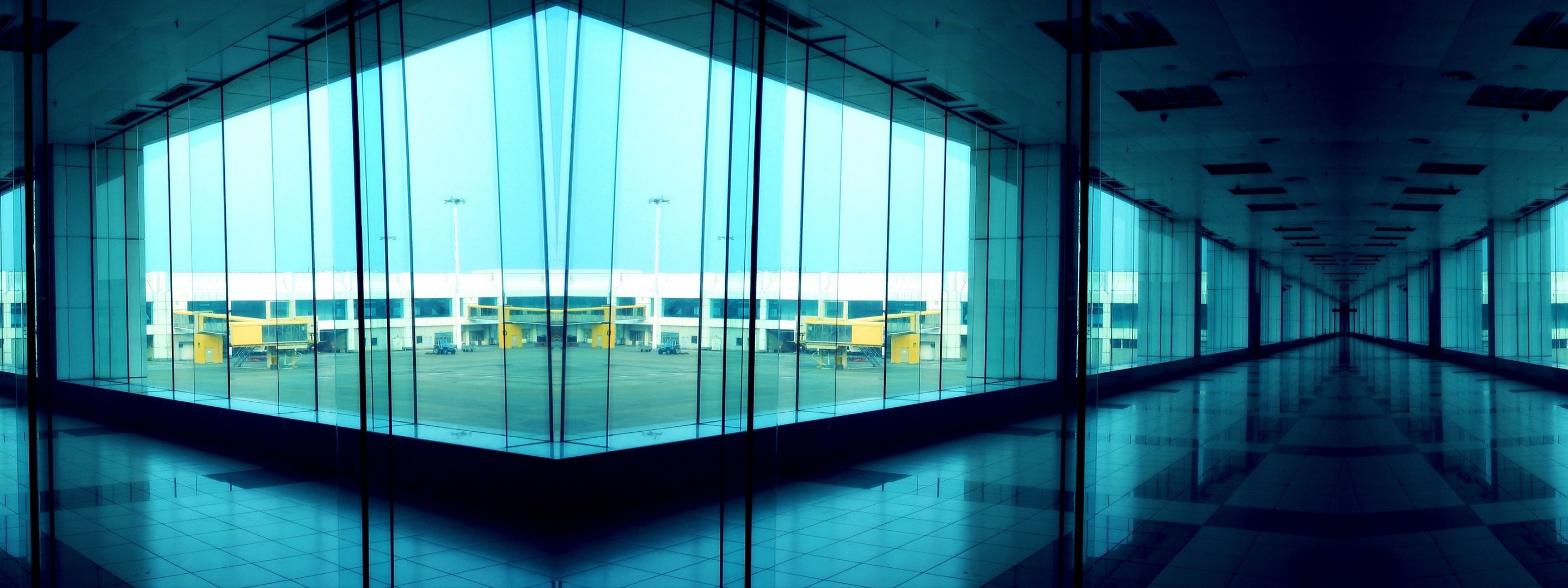 Panoramafoto eines Gebäudes mit großen Fenstern von innen