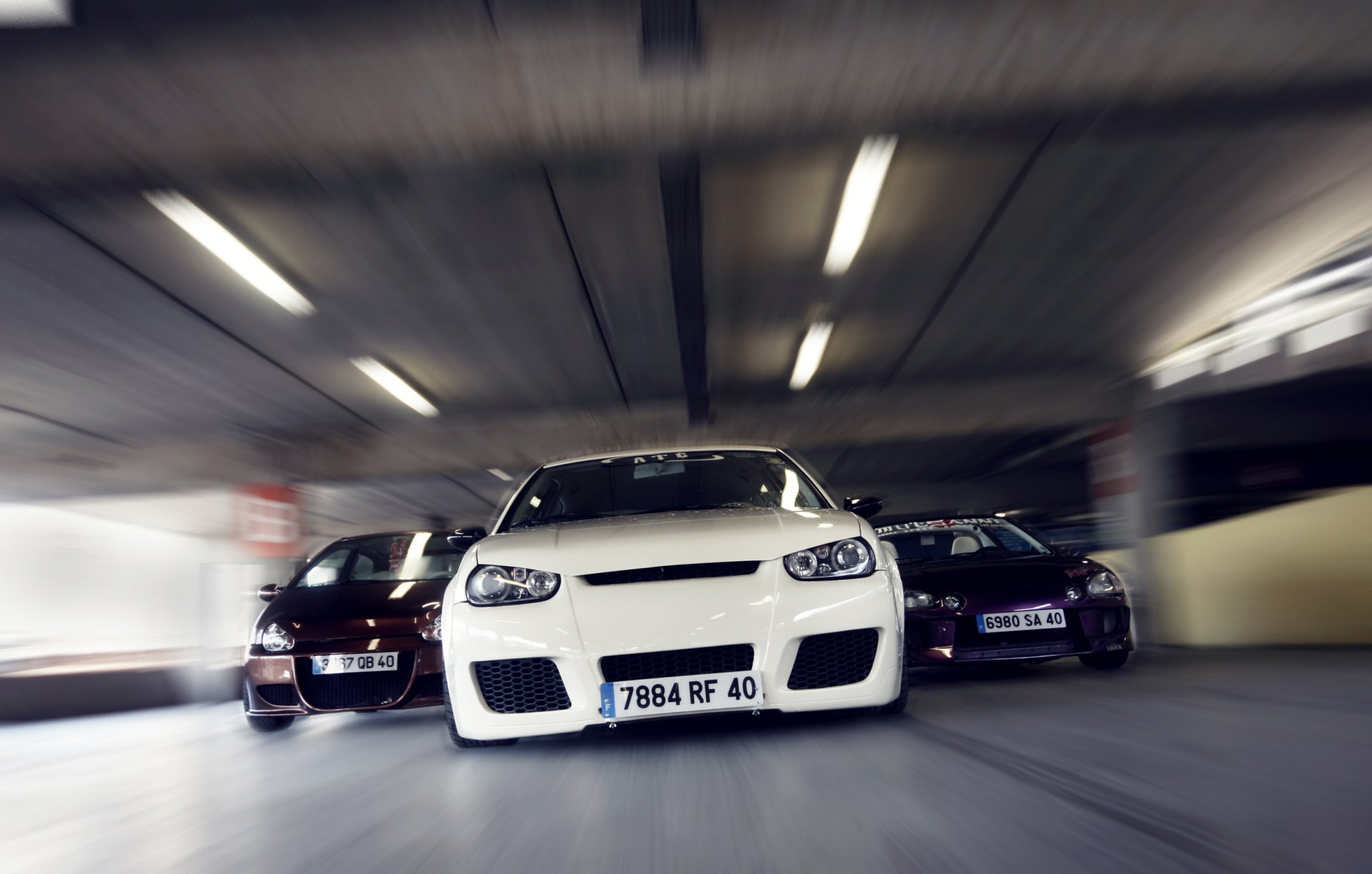 Zwei weiße Autos mit eingeschalteten Scheinwerfern auf der Strecke