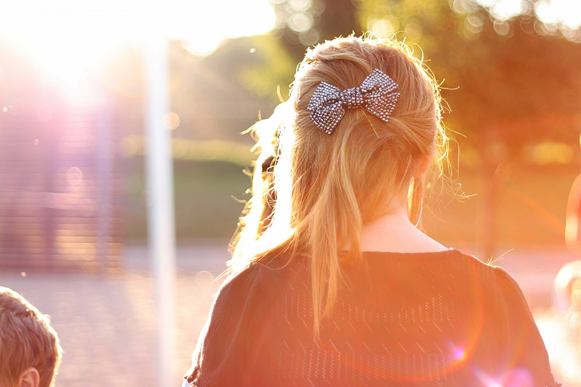 Frisur eines Mädchens mit einem Bogen in der Sonne