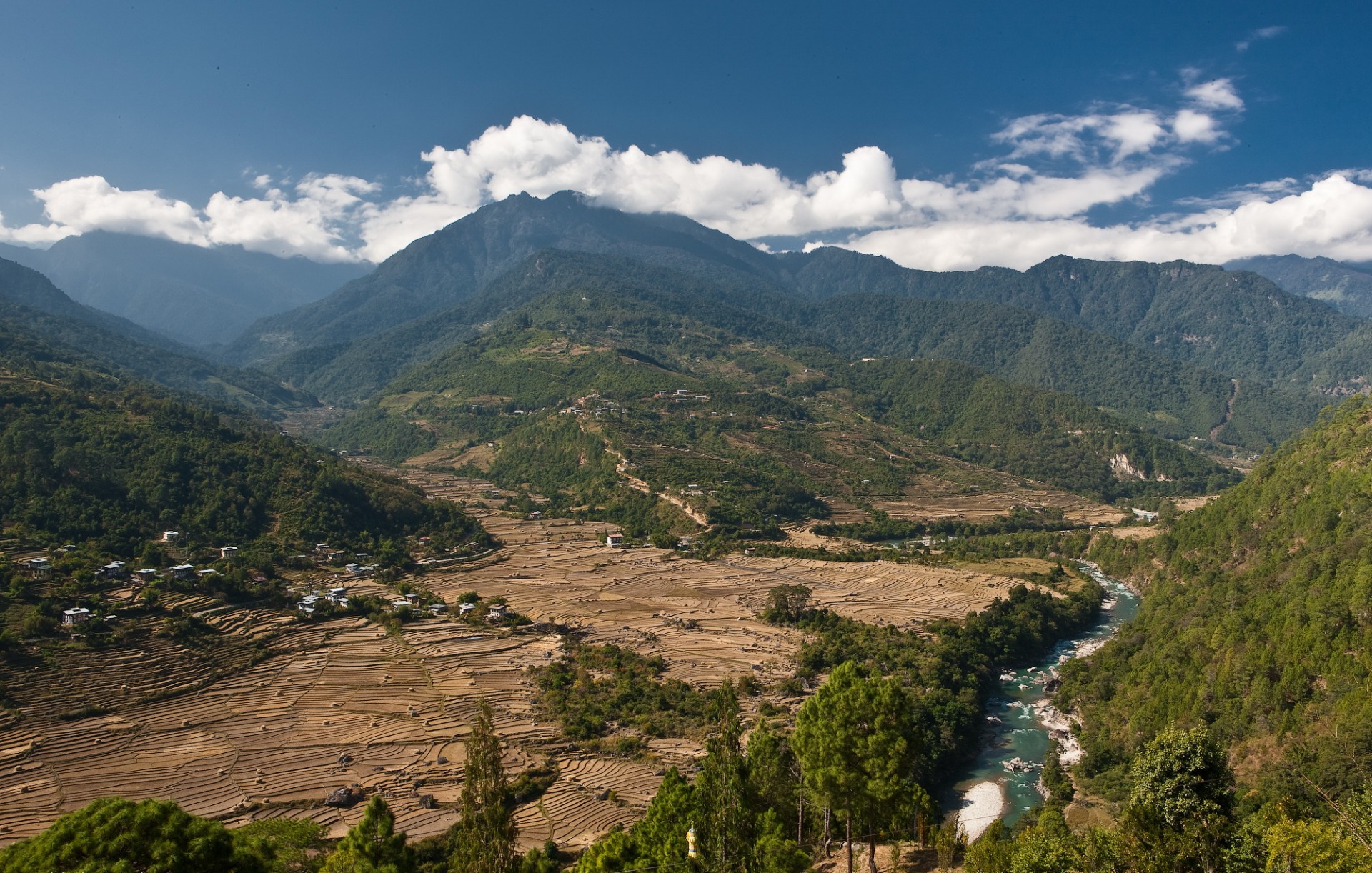 Ein Dorf mit Feldern und einem Fluss in den Bergen