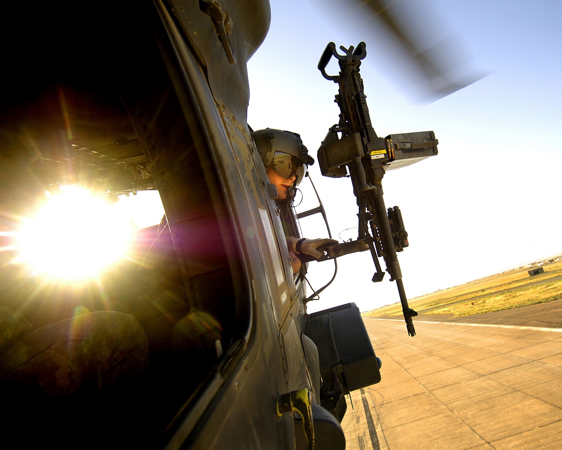 Ein soldat mit einer waffe sitzt in einem hubschrauberlandeplatzEin Soldat mit einer Waffe sitzt in einem Hubschrauberlandeplatz