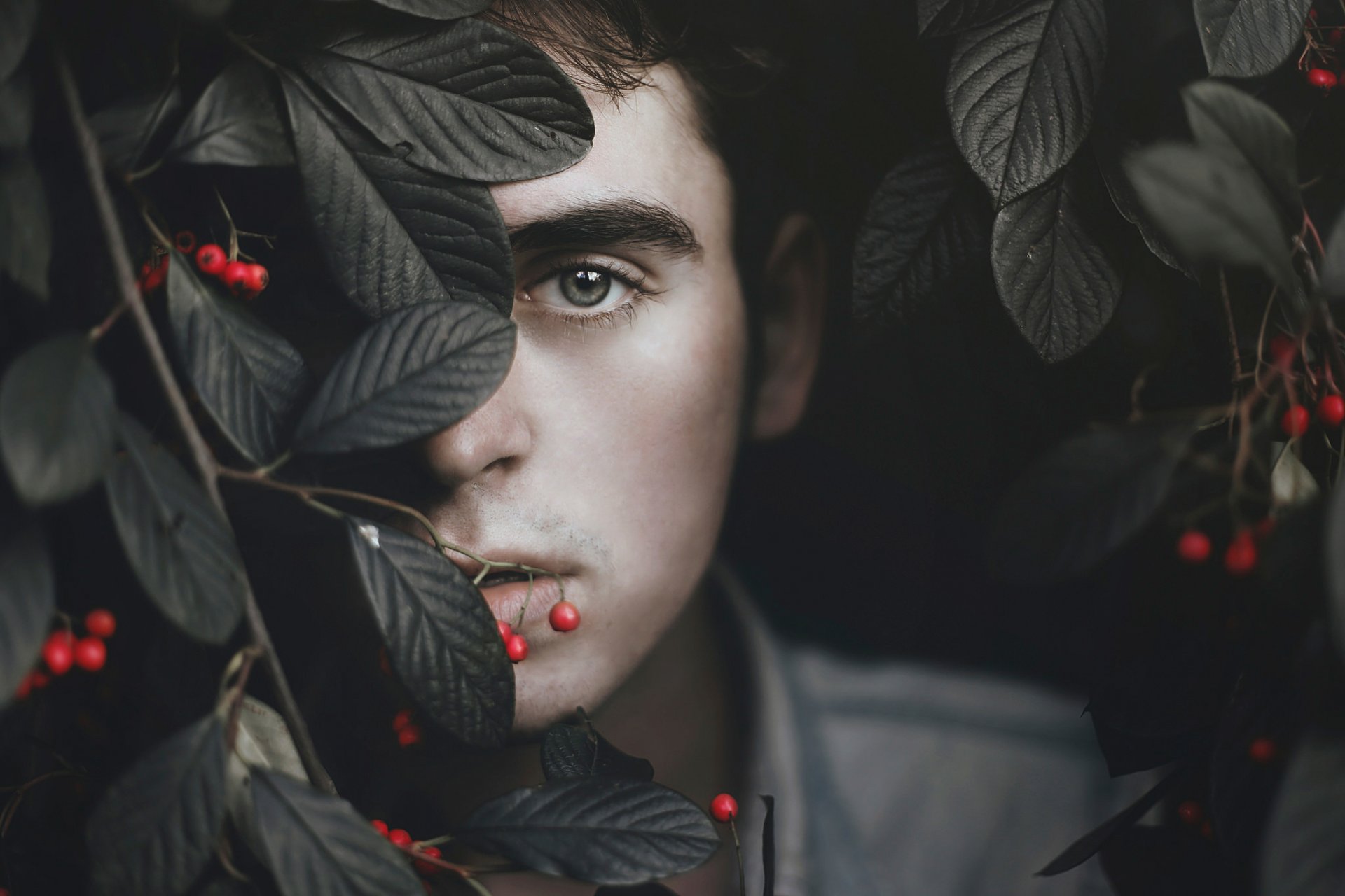 Der parent schaut hinter einem baum mit roten beeren zuDer Parent schaut hinter einem Baum mit roten Beeren zu