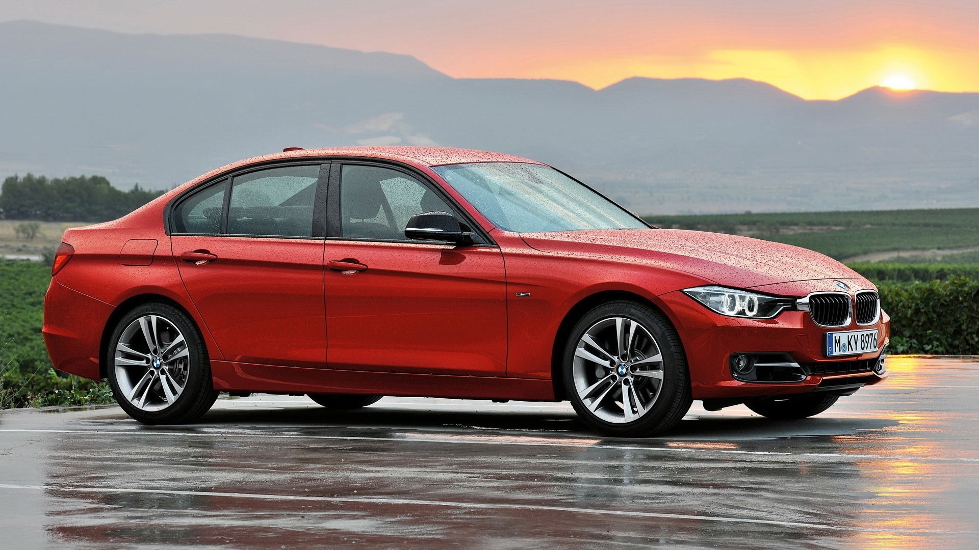 Rote limousine vor dem hintergrund der berge und des himmelsRote Limousine vor dem Hintergrund der Berge und des Himmels