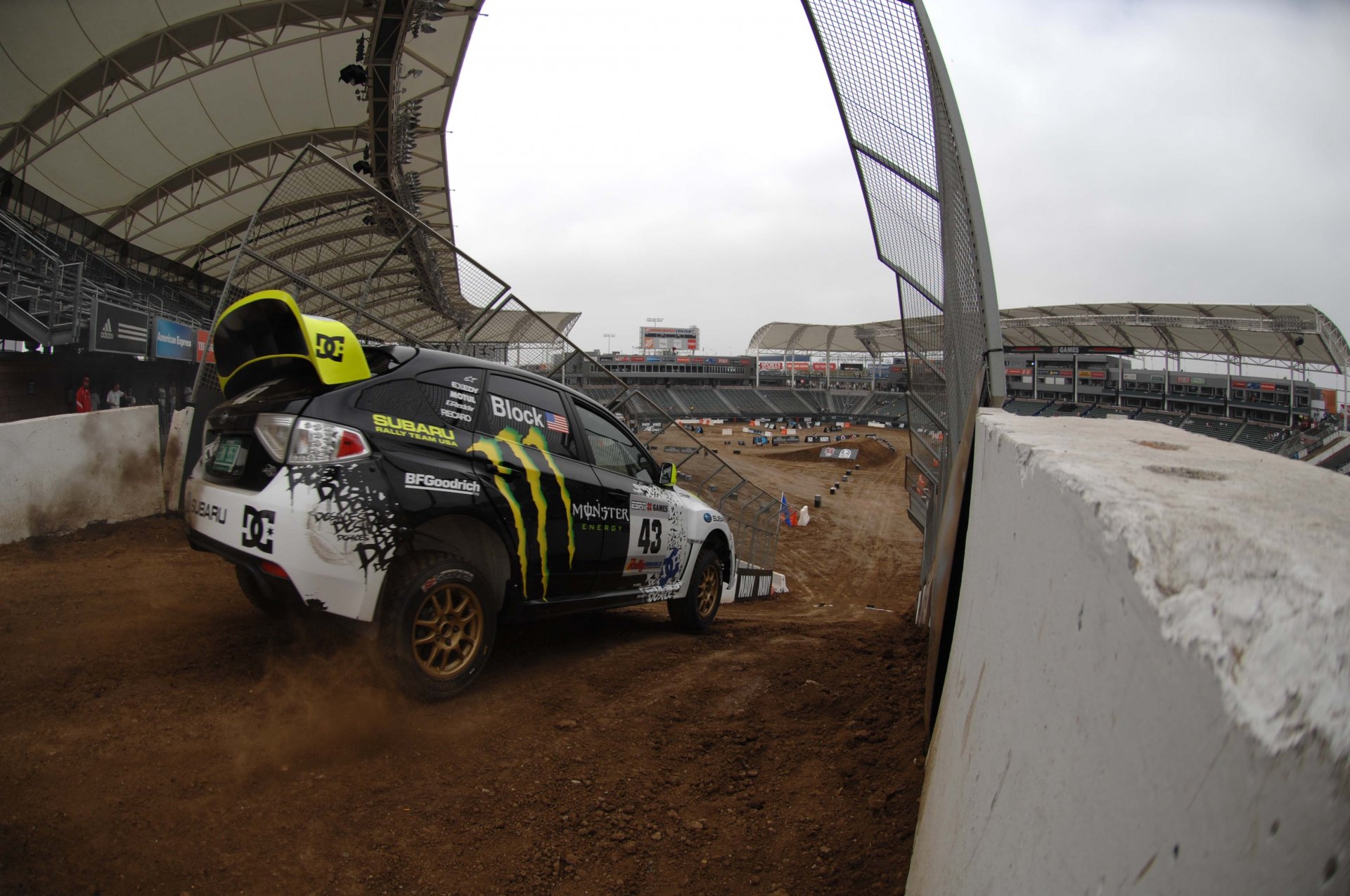 Blauer Subaru impreza kommt beim Rennen in die Kurve