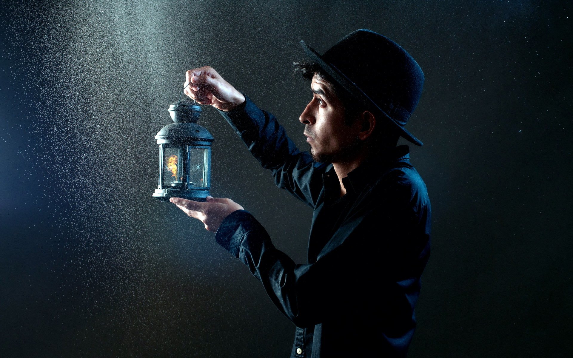 Ein Mann im Dunkeln mit einer Taschenlampe in den Händen
