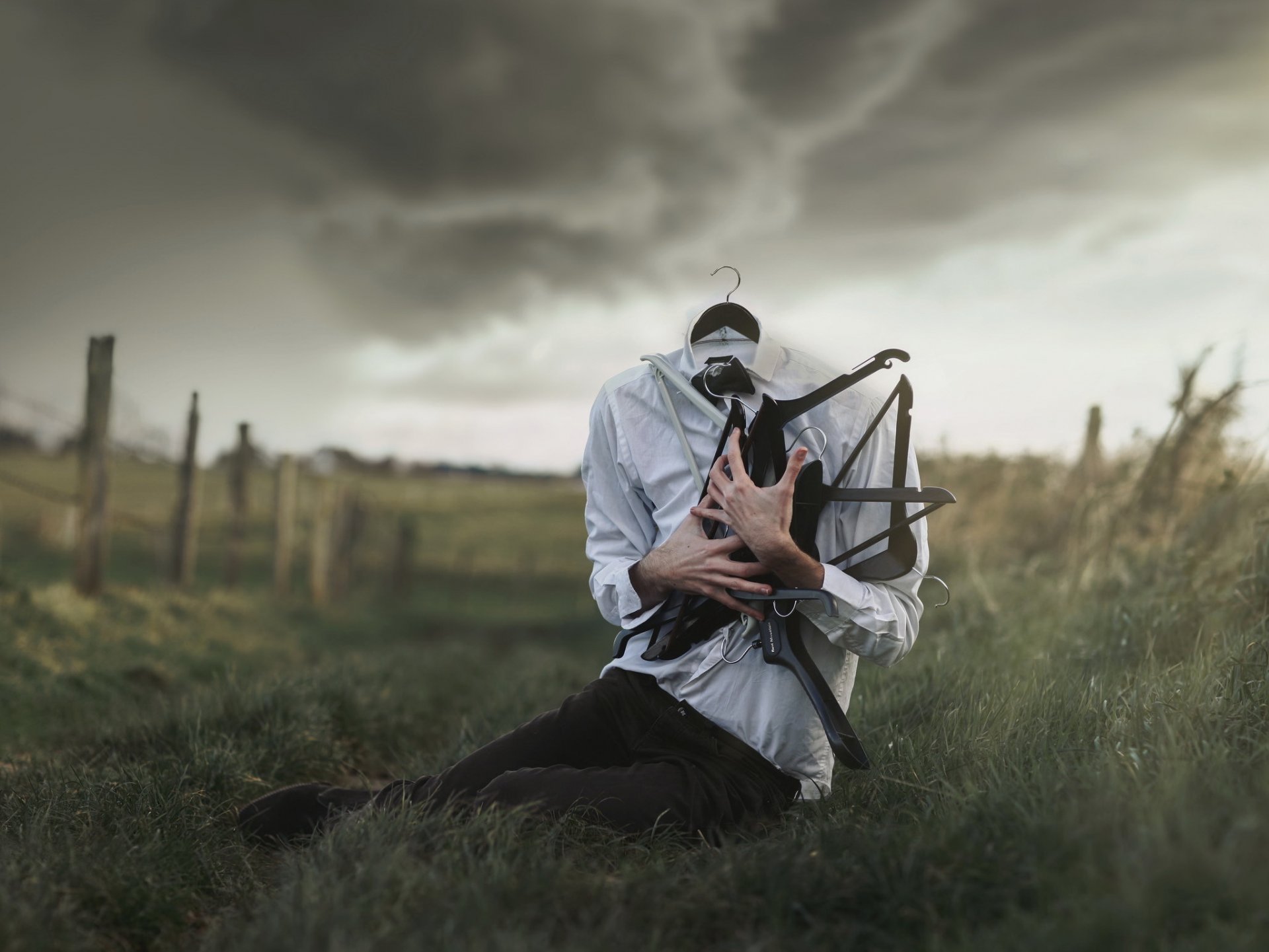 Mann in der mitte des feldes mit aufhängern in der handMann in der Mitte des Feldes mit Aufhängern in der Hand