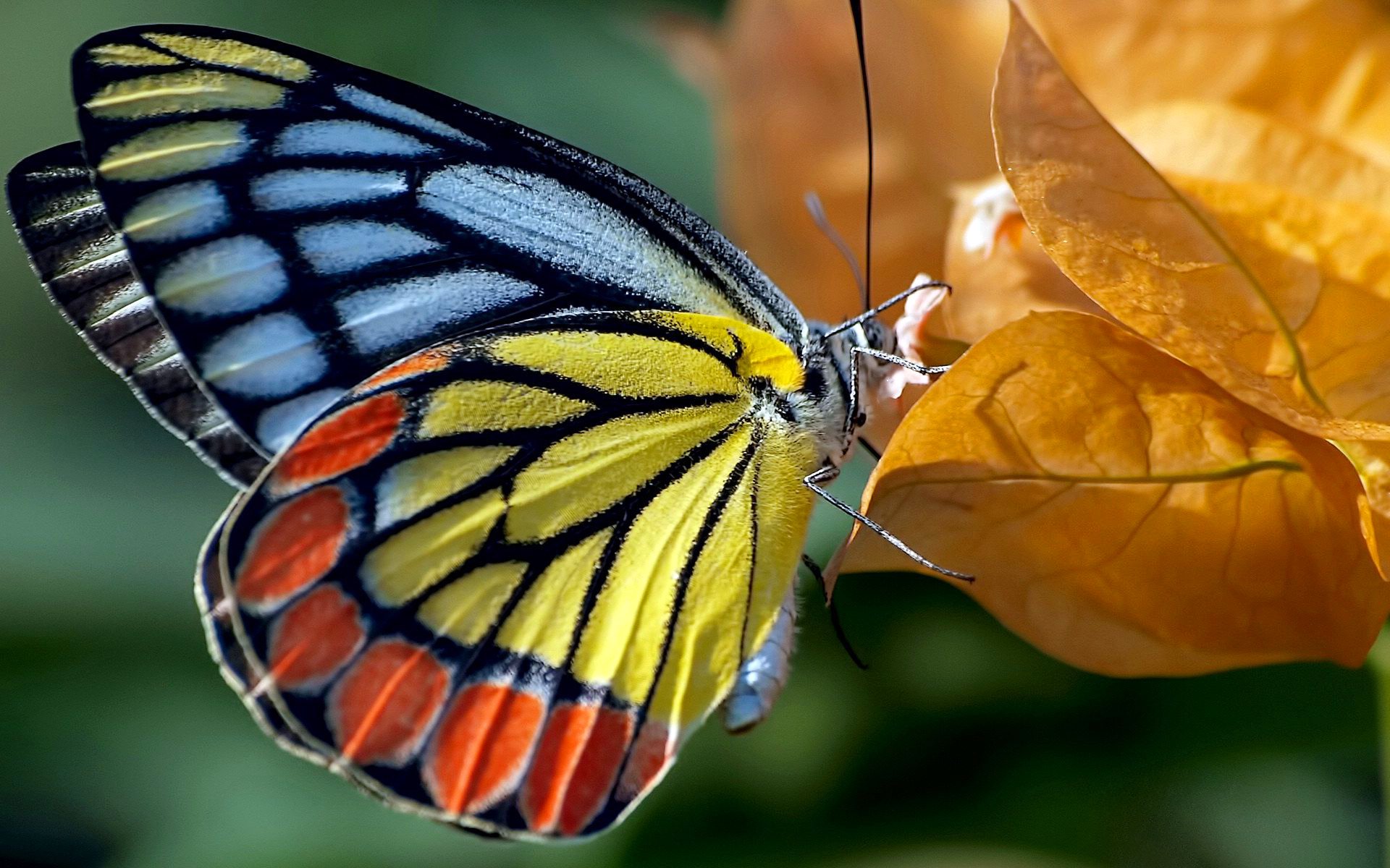 Makroaufnahme einer Wespe in der Nähe einer Blume vor einem blauen Himmelshintergrund