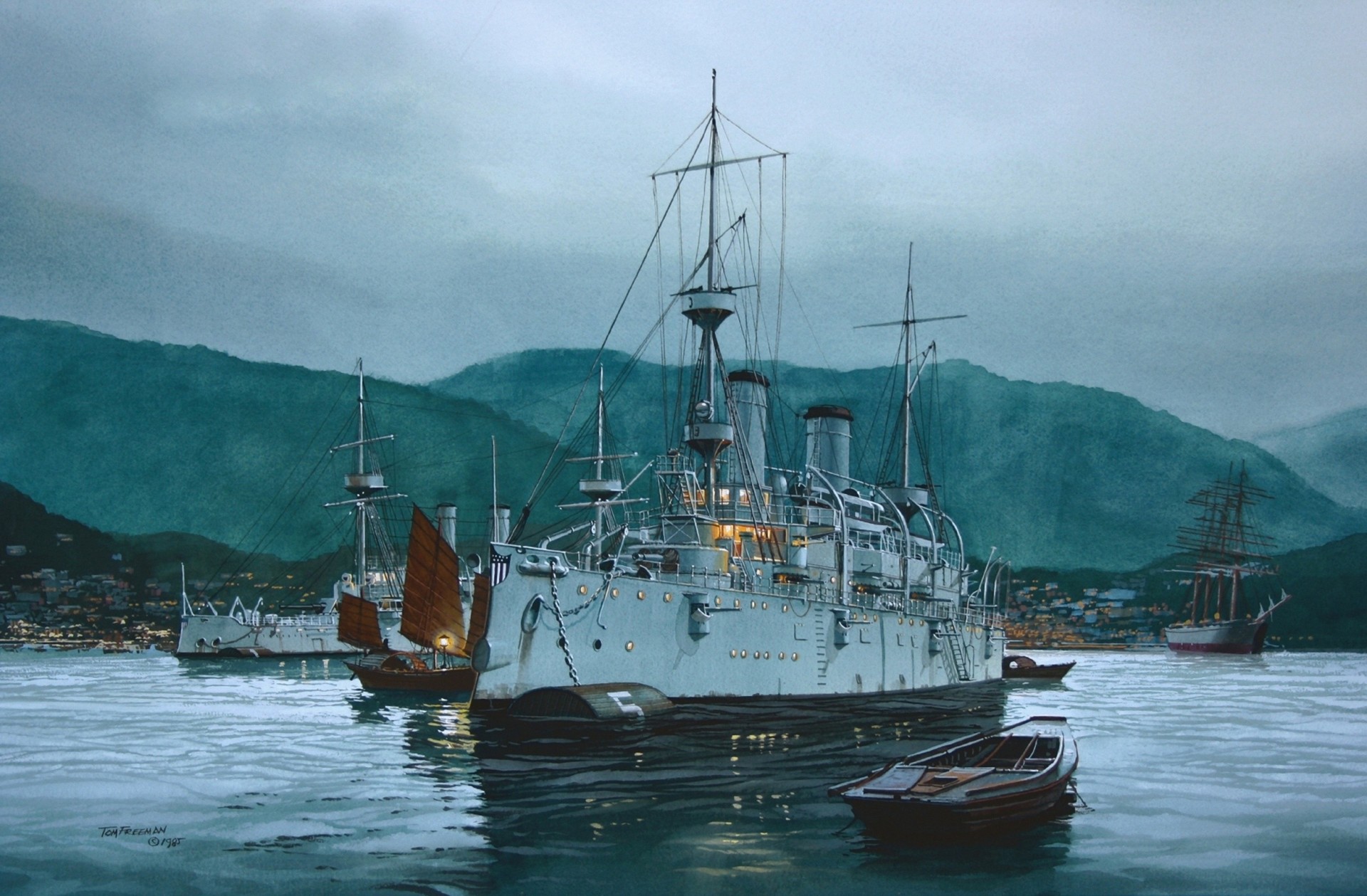 Vor dem Hintergrund der Berge segelt das Schiff in den Hafen