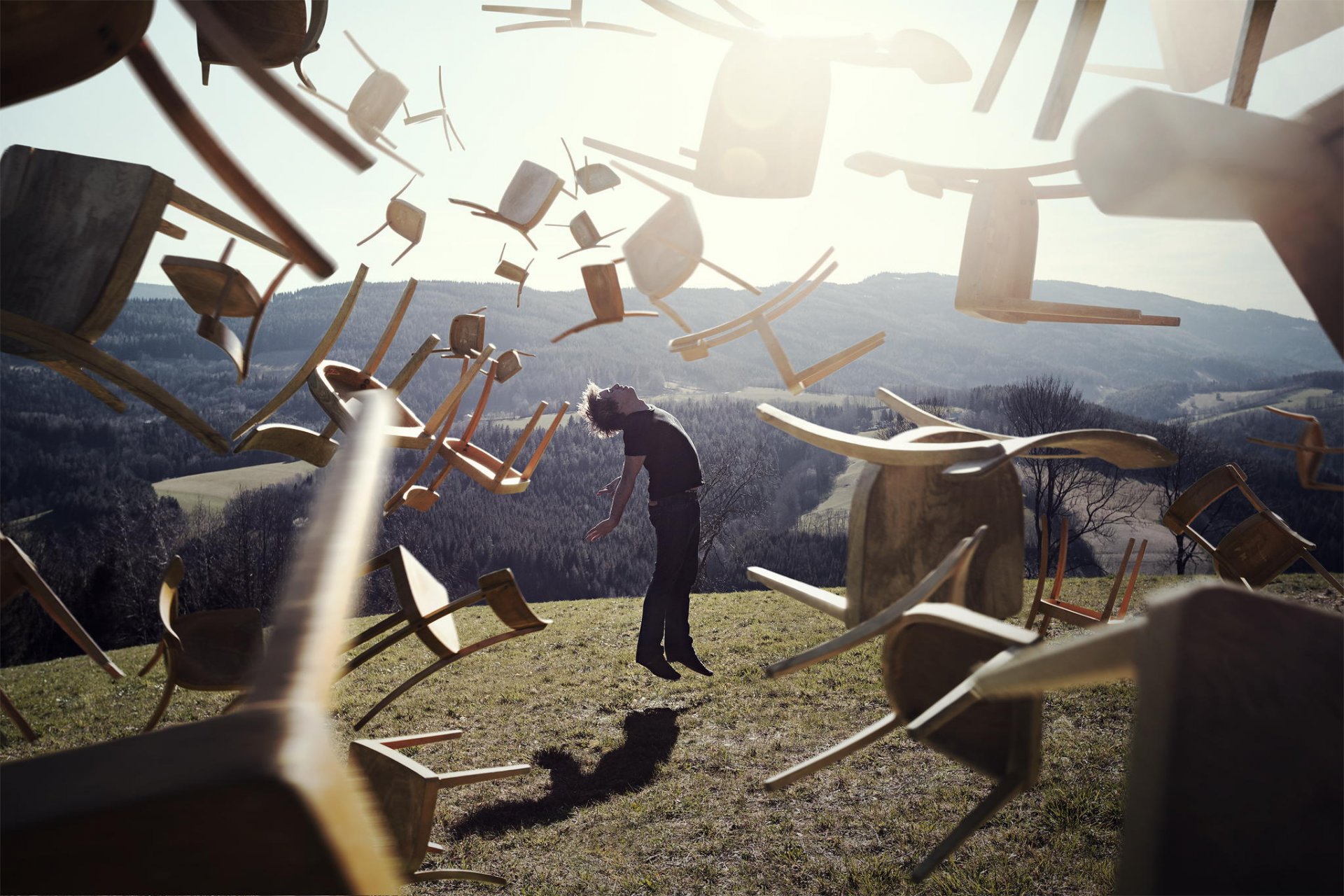 Ein Mann in einer Gasmaske vor dem Hintergrund einer Explosion