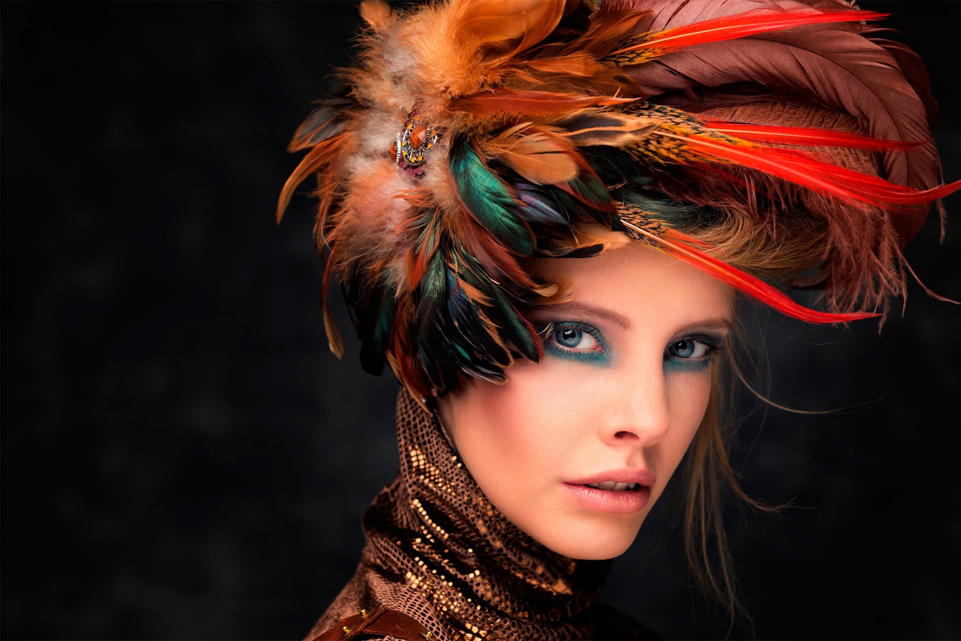 Mädchen mit Make-up mit Kopfbedeckung mit Federn