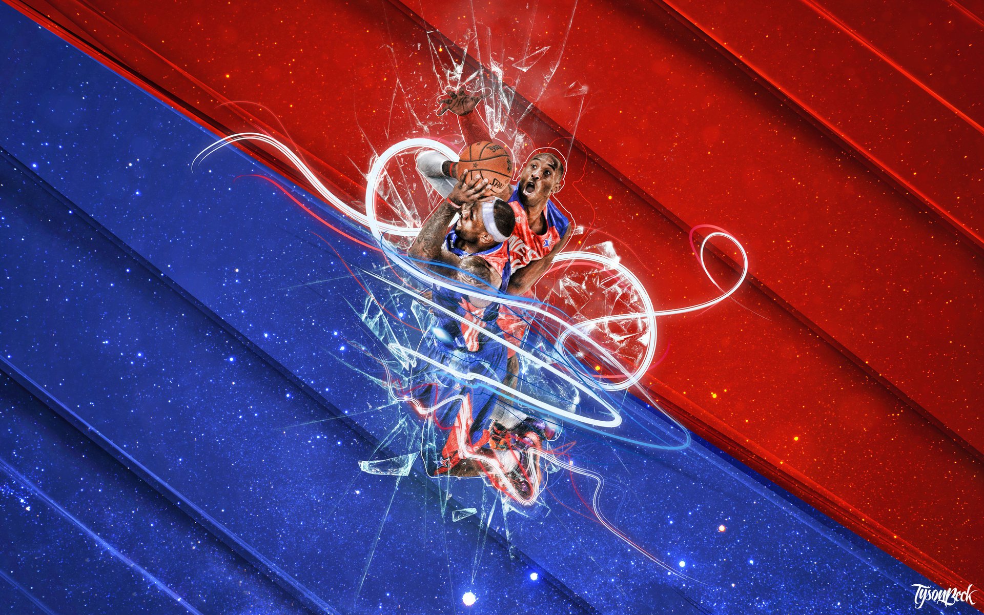 Basketballspieler im Sprung mit dem Ball in der rechten Hand auf rotem Grund