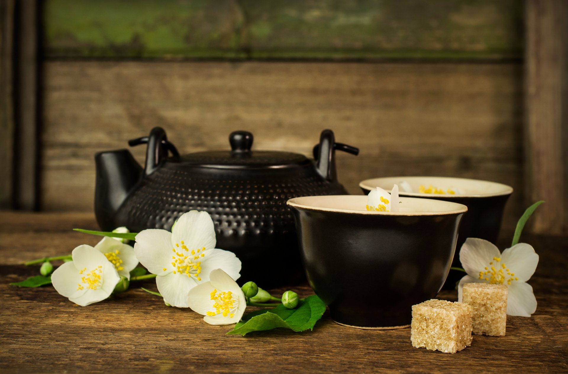 Parfüm-buch und jasmin in einer vase auf dem tischParfüm-Buch und Jasmin in einer Vase auf dem Tisch