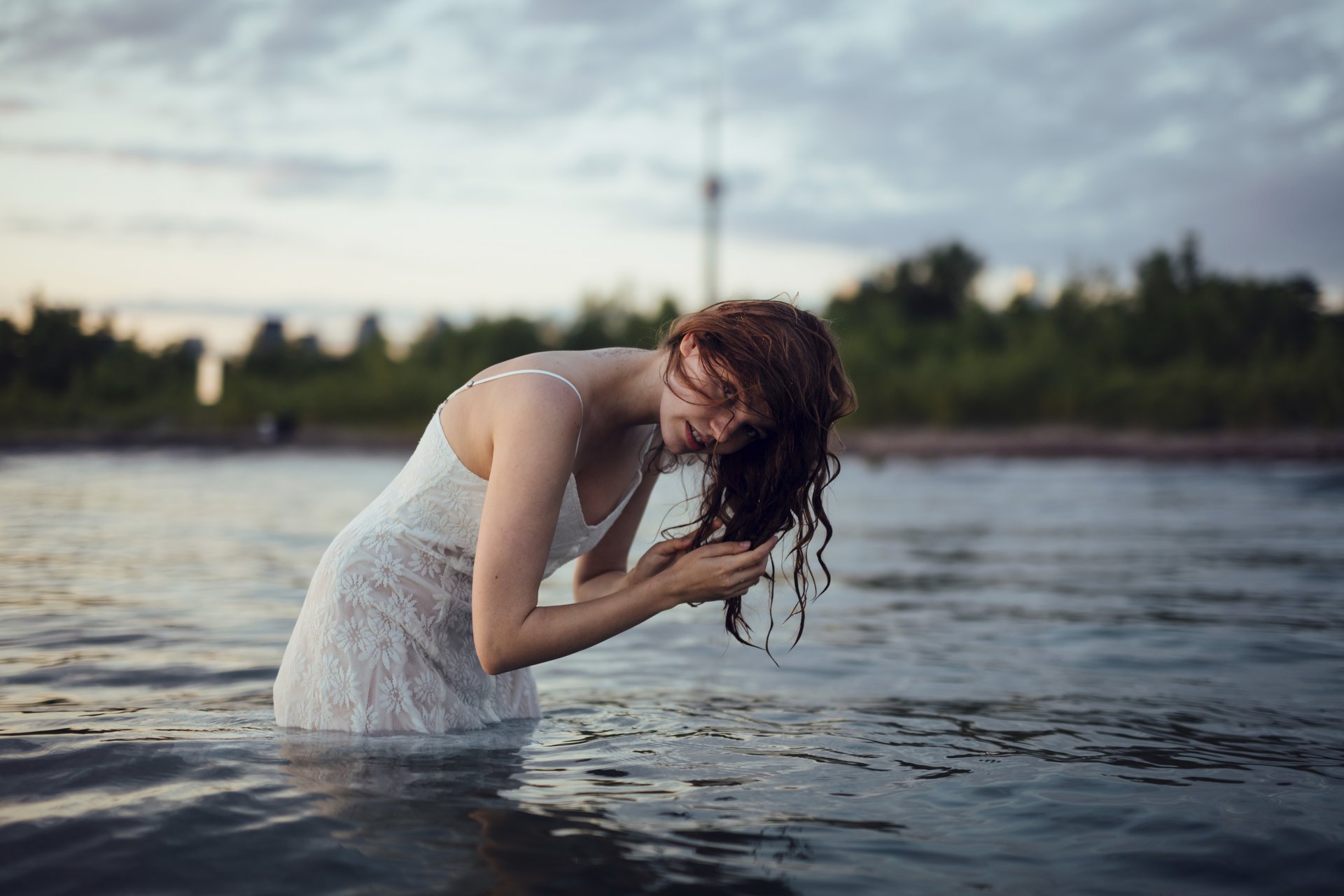 Mädchen mit Sommersprossen und nassen Haaren im Wasser