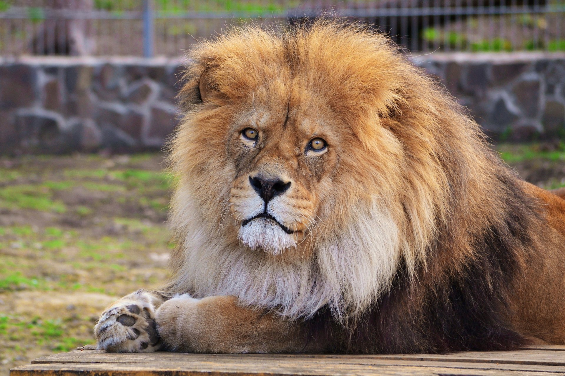 Ein Löwe mit einer zottigen Mähne liegt auf dem Bauch