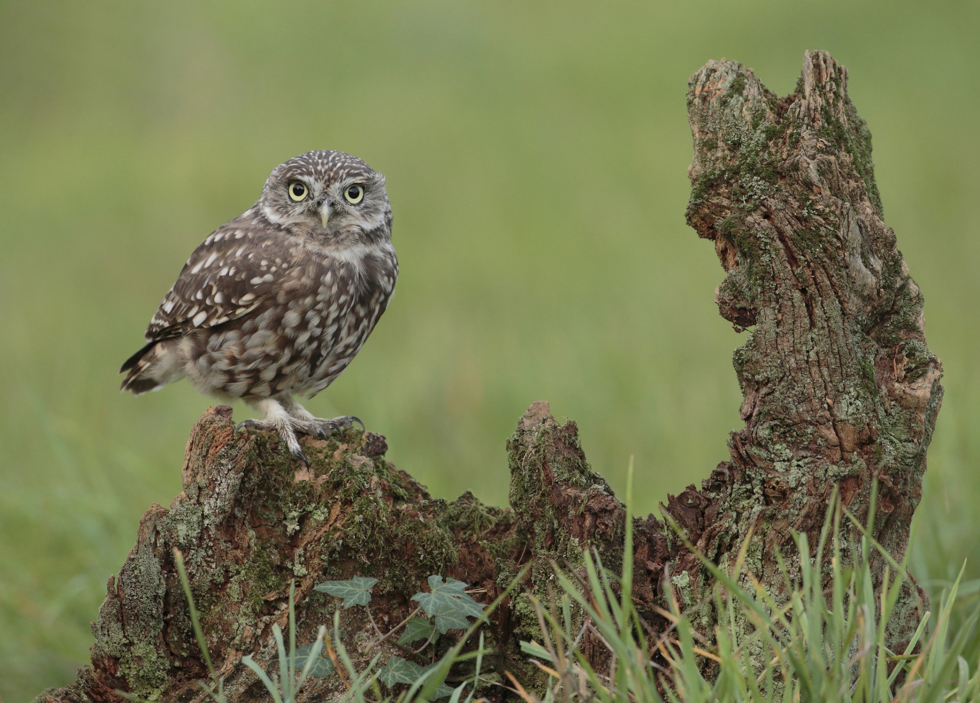Blick auf eine eule, die auf einem treibholz sitztBlick auf eine Eule, die auf einem Treibholz sitzt