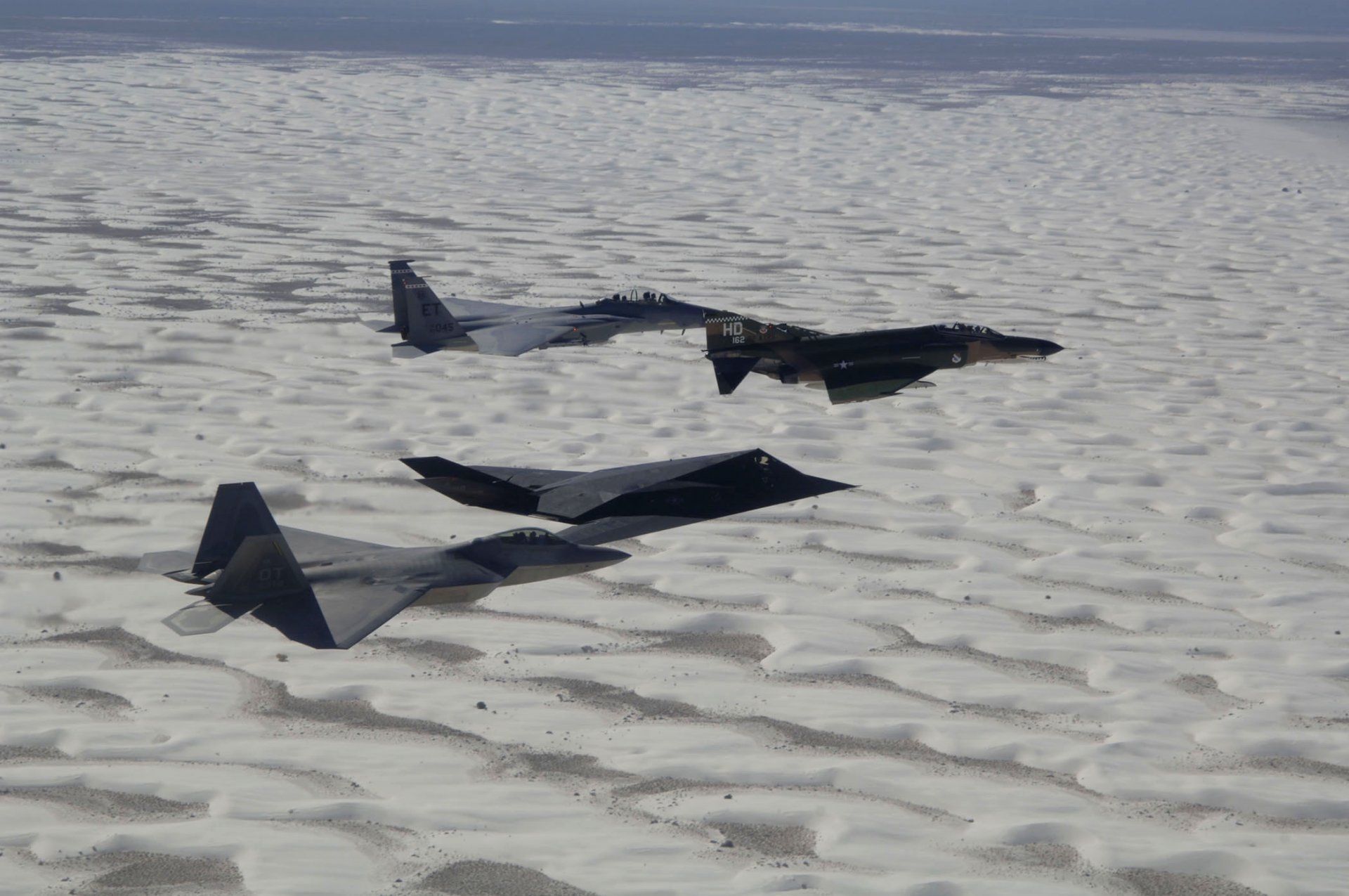 Mattschwarzer kampfflugzeugkeil über dem weißen wüstensandMattschwarzer Kampfflugzeugkeil über dem weißen Wüstensand