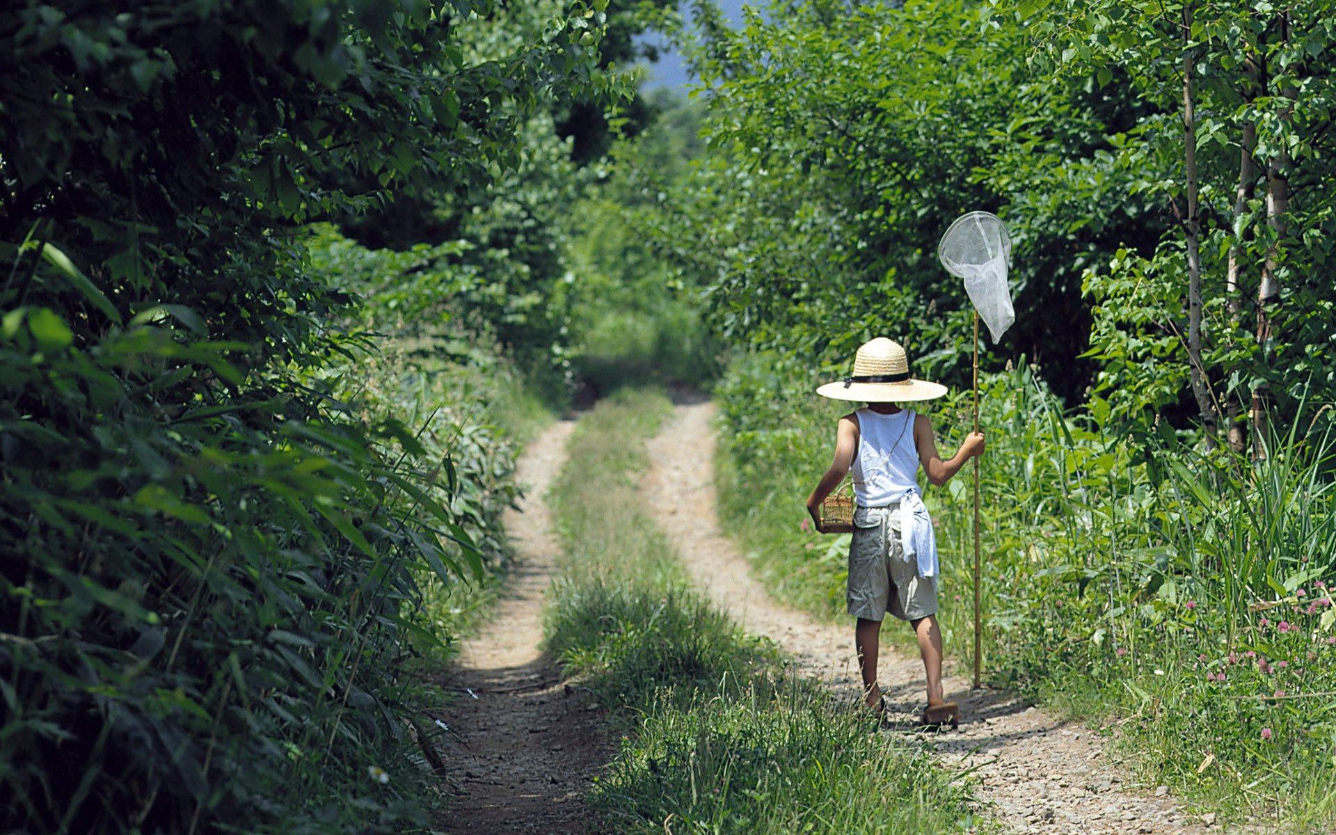 Ein junge mit einem hut mit einem netz, der den weg entlang gehtEin Junge mit einem Hut mit einem Netz, der den Weg entlang geht