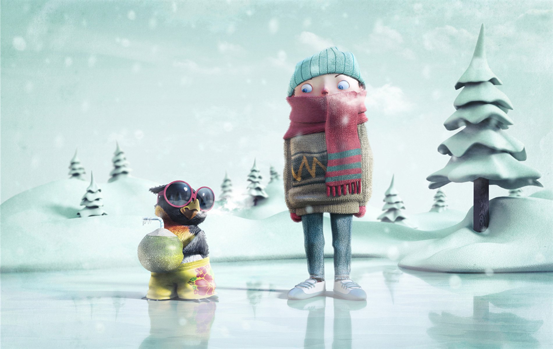 Schönes Winterbild, ein Kind mit einem Pinguin, eine Wintereisbahn