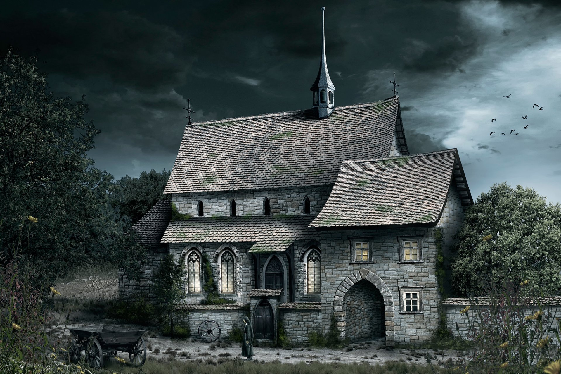 Die Kirche ist in Nebel über dem Wasser gehüllt