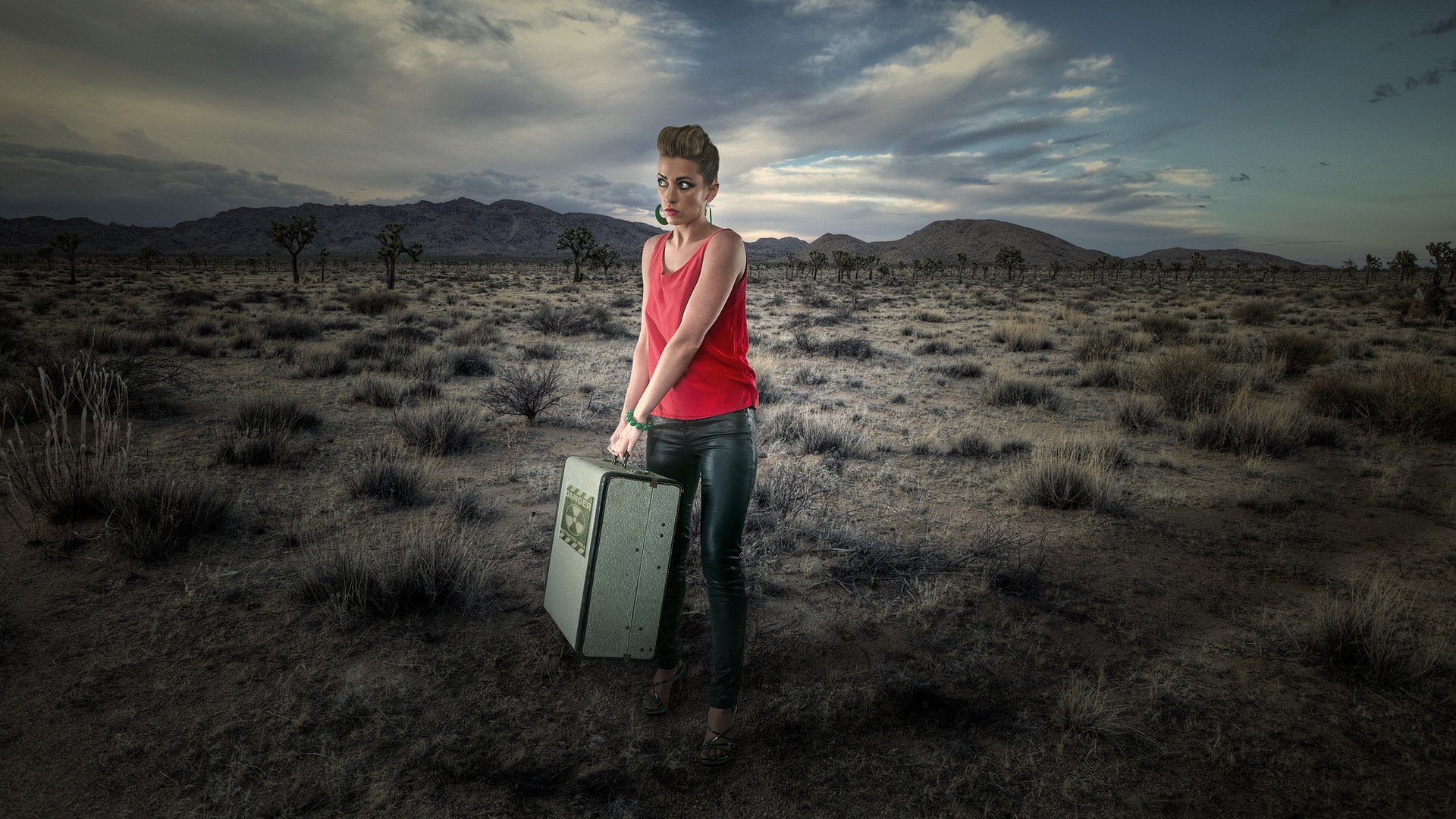 Ein Mädchen, das auf einem Koffer am Straßenrand sitzt. Der Wind flattert Ihr Haar