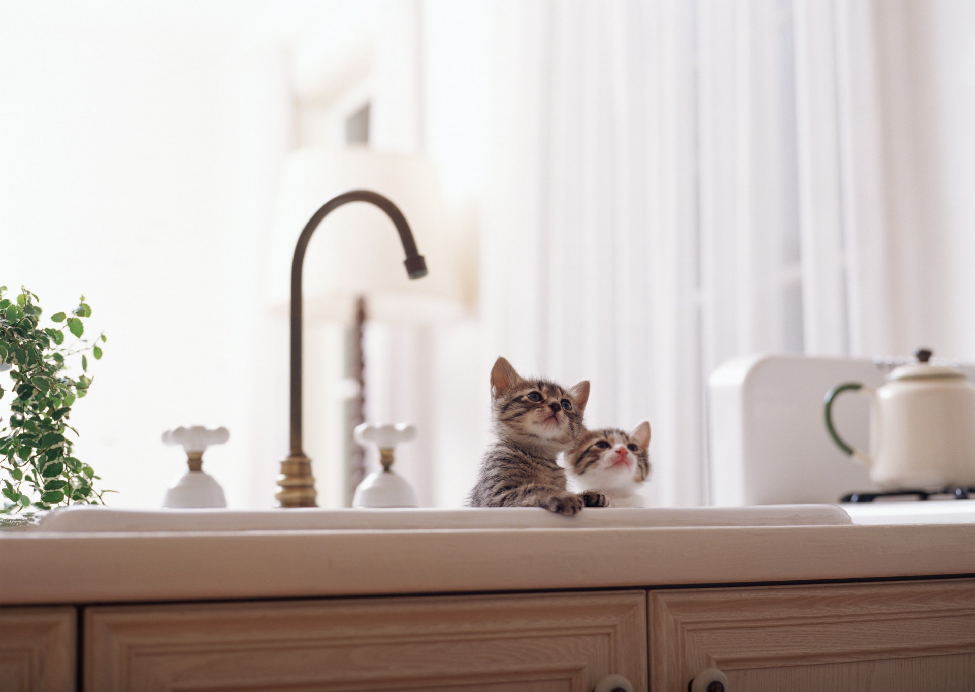 Kleine Kätzchen sitzen in der Küche neben dem Wasserhahn