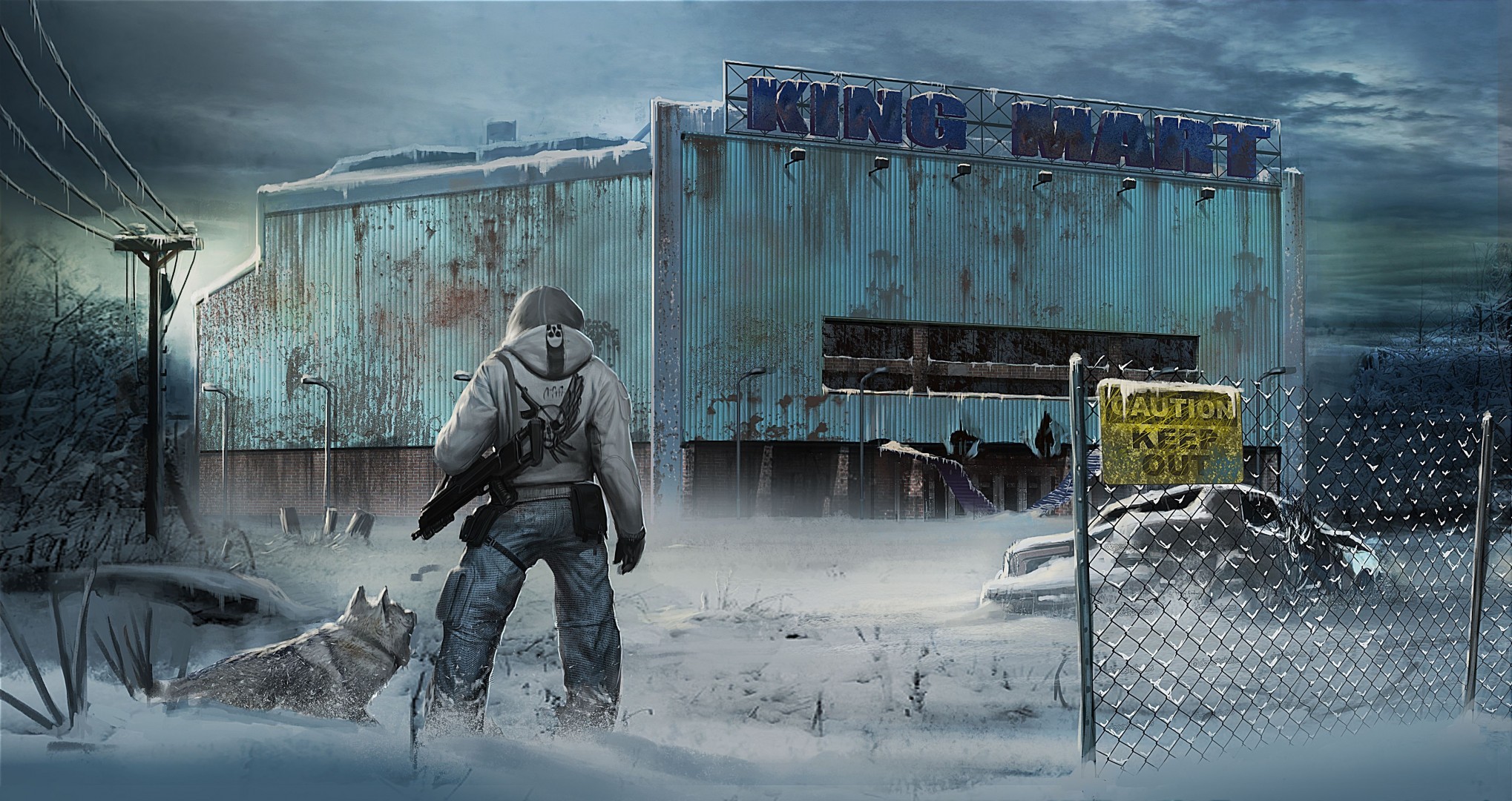 In der stadt steht ein mann mit einem hund im nebel