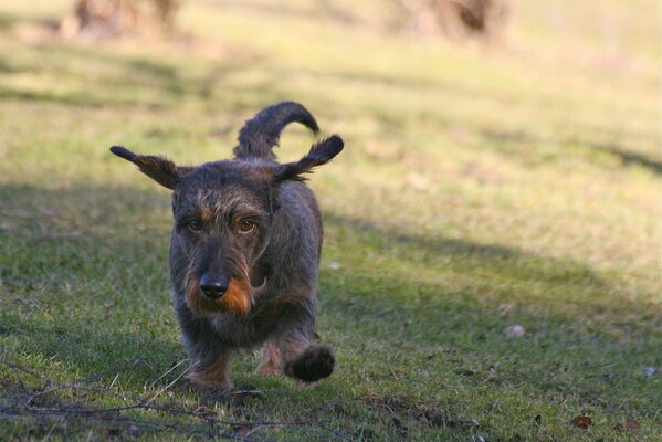 Ein kleiner Welpe späht hinter einem Vorhang aus