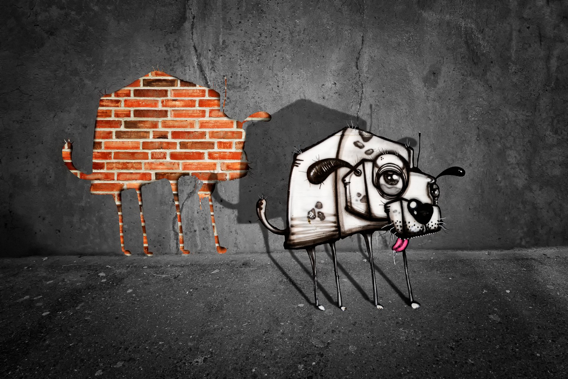 Kreative Zeichnung eines Hundes auf einem grauen Wandhintergrund
