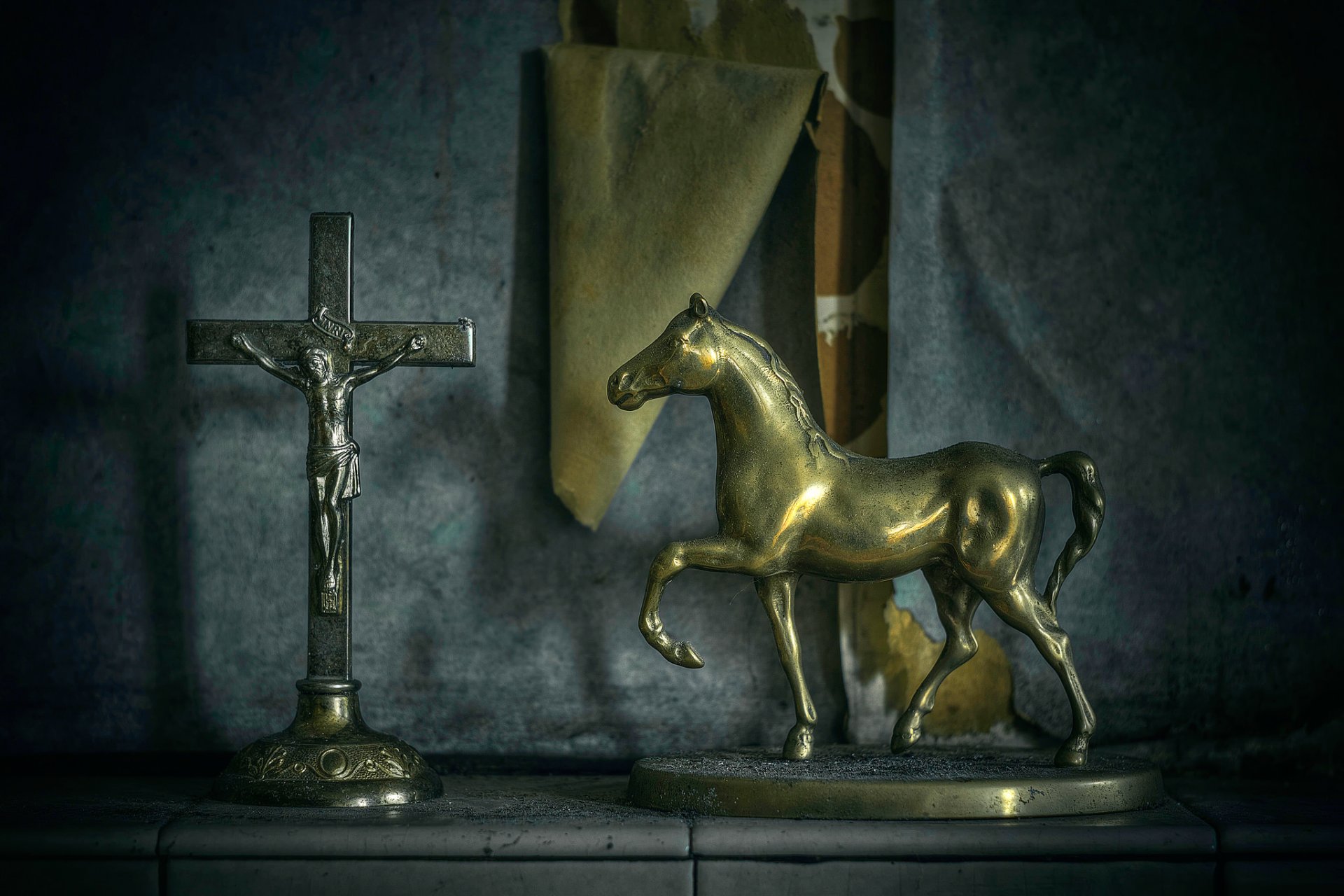 Auf dem Hintergrund der Tapete, die von der Wand entfernt ist, stehen eine Statuette eines Pferdes und ein Kruzifix