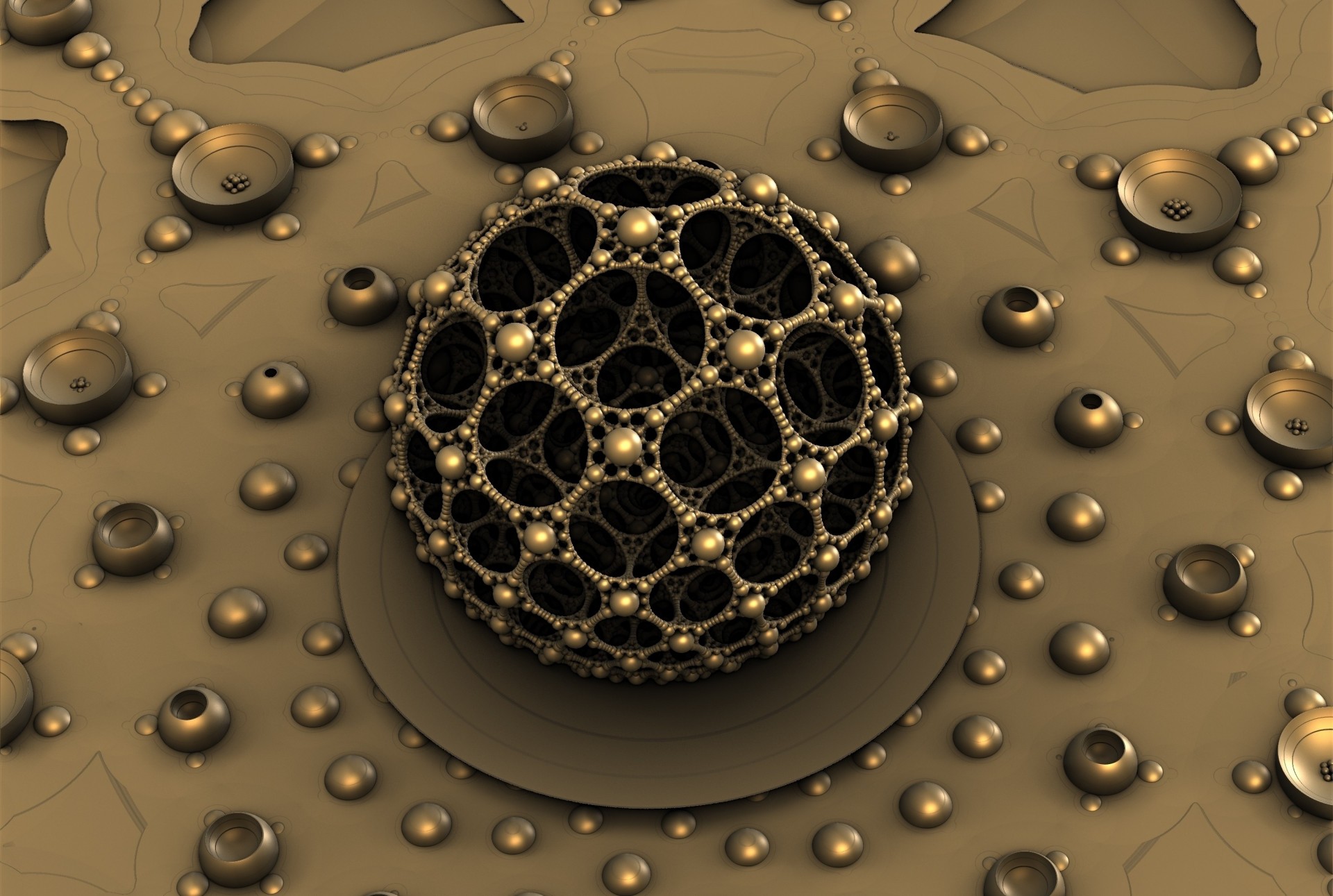 Eine große schwarz-goldene Kugel ist umgeben von goldenen Löffeln