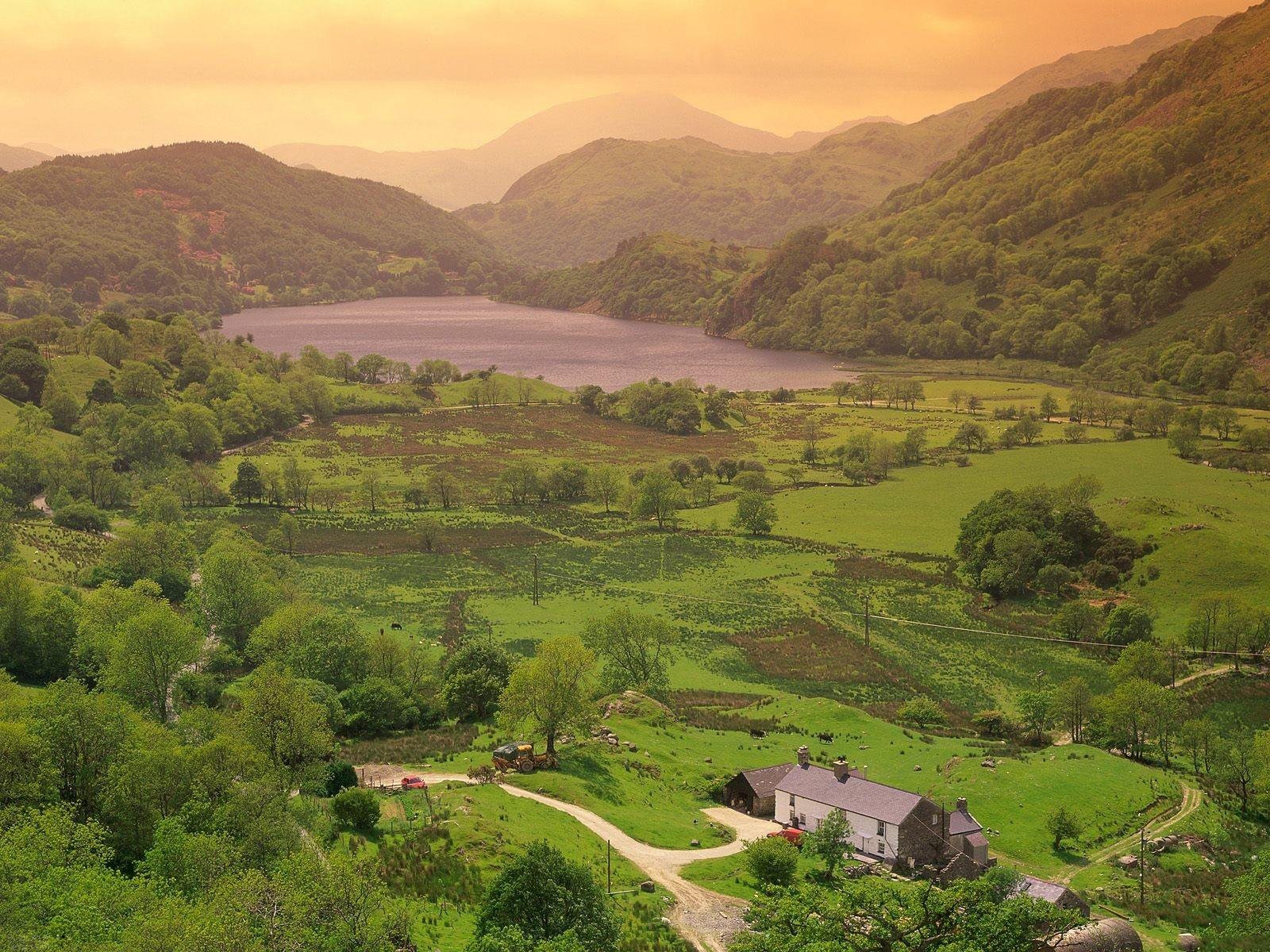 Ein Fluss, der Weizenfelder und ein Dorf trennt