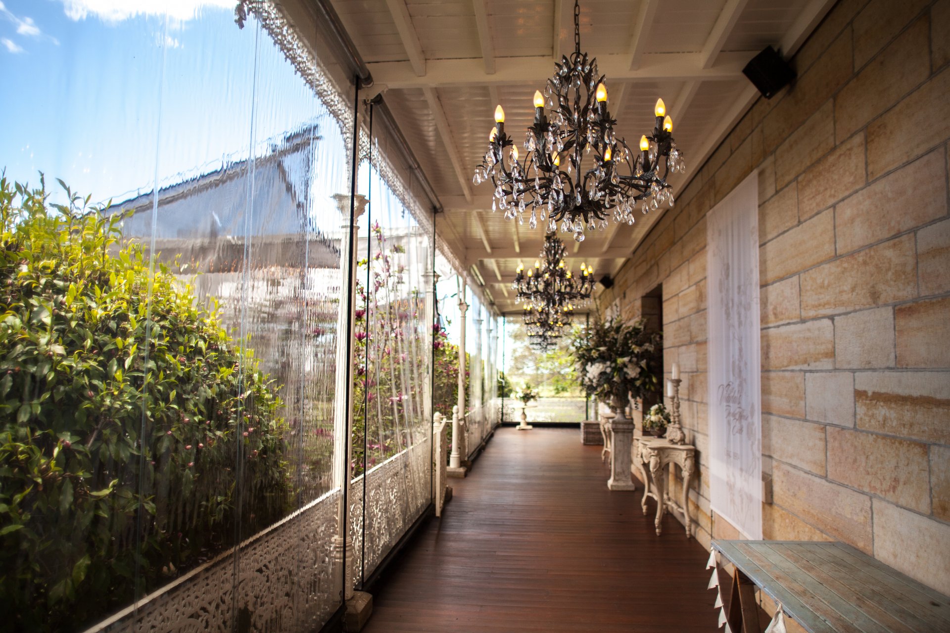 Luxuriöser balkon mit eleganten kronleuchtern und tischenLuxuriöser Balkon mit eleganten Kronleuchtern und Tischen