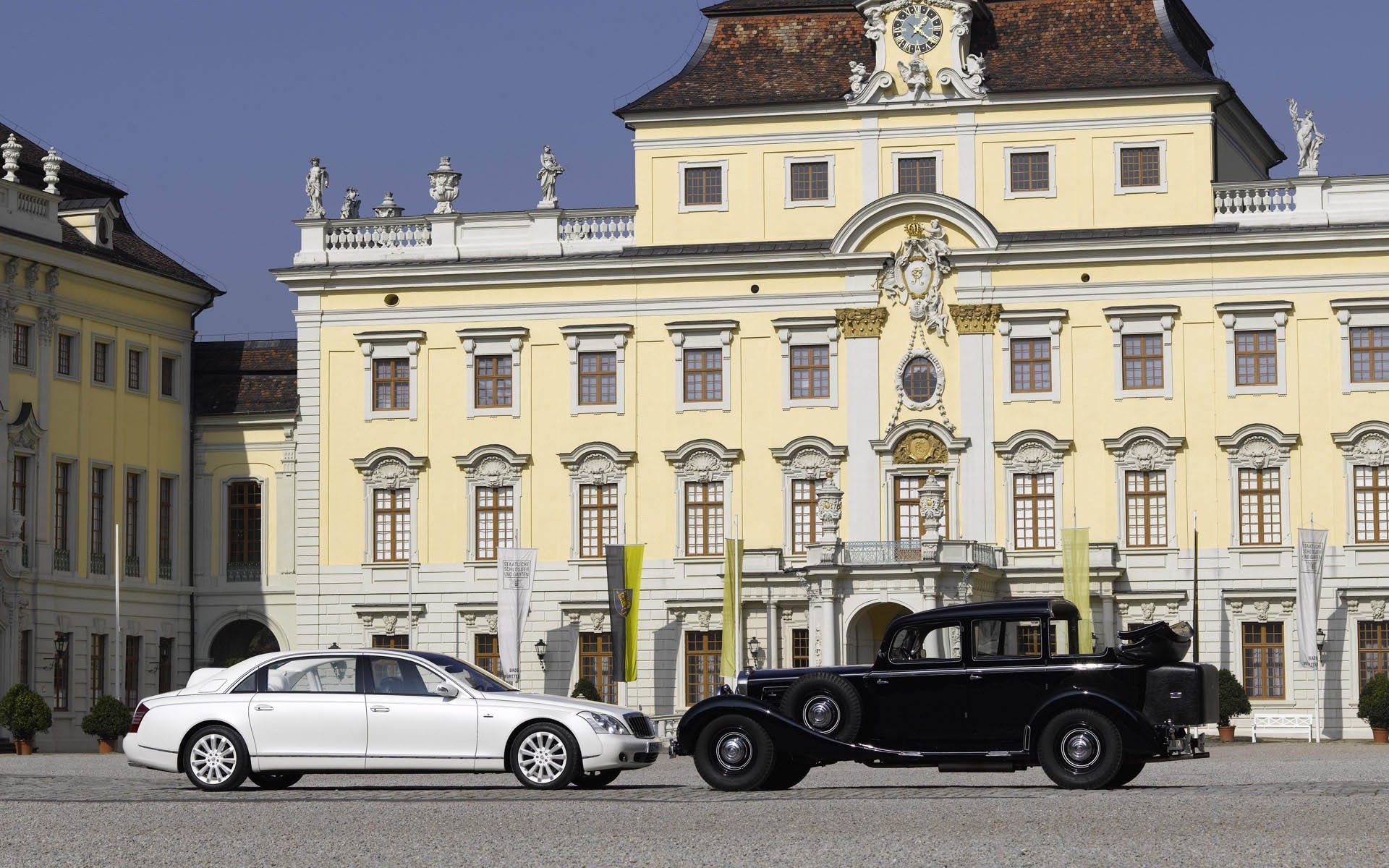 Weißer Maybach und schwarzes Auto auf dem Hintergrund des Gebäudes