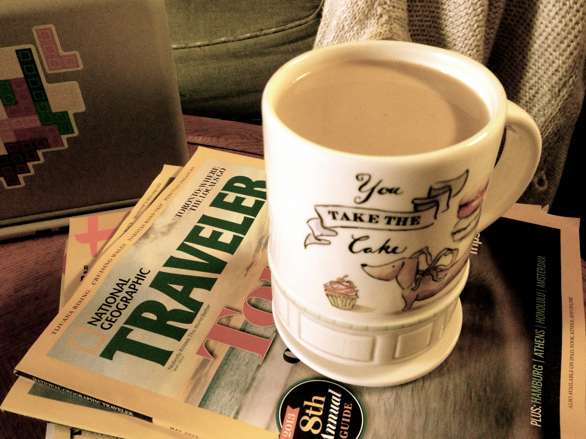 Ein Latte-Becher steht auf Zeitschriften