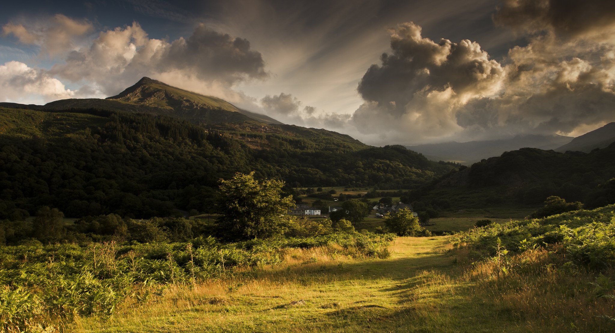 Im Hintergrund des Tals sind riesige schneebedeckte Berge zu sehen