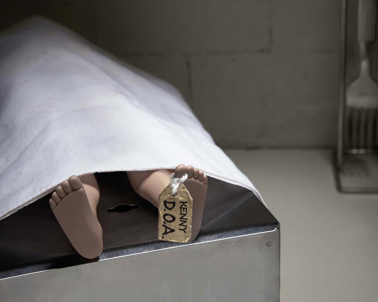In der Leichenhalle ist der Körper mit einem Laken und einem Etikett am Bein bedeckt