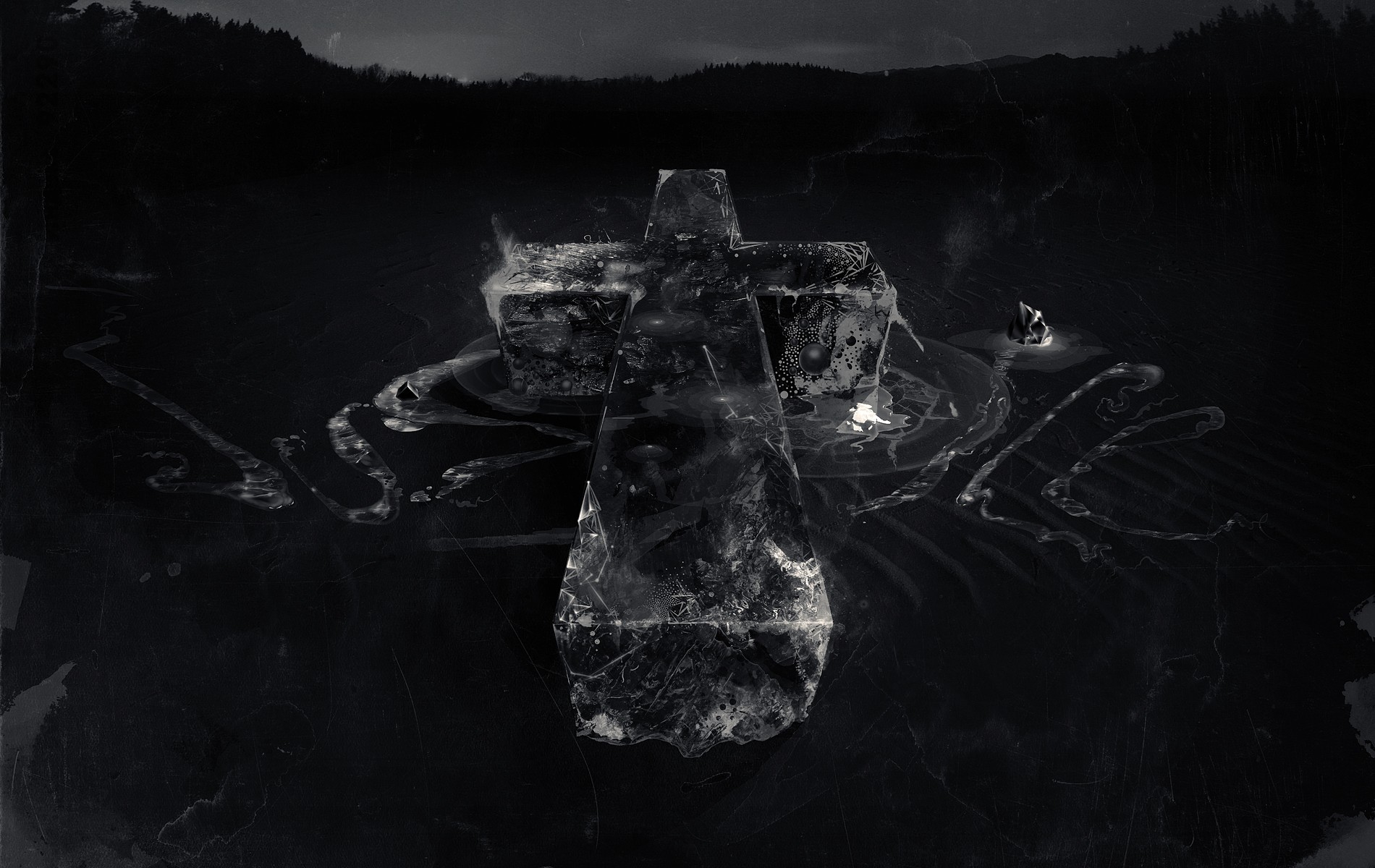 Ein schwarz-weißes kreuz, das vor einem dunklen hintergrund aus granit besteht und leicht beleuchtet istEin schwarz-weißes Kreuz, das vor einem dunklen Hintergrund aus Granit besteht und leicht beleuchtet ist