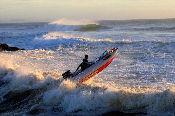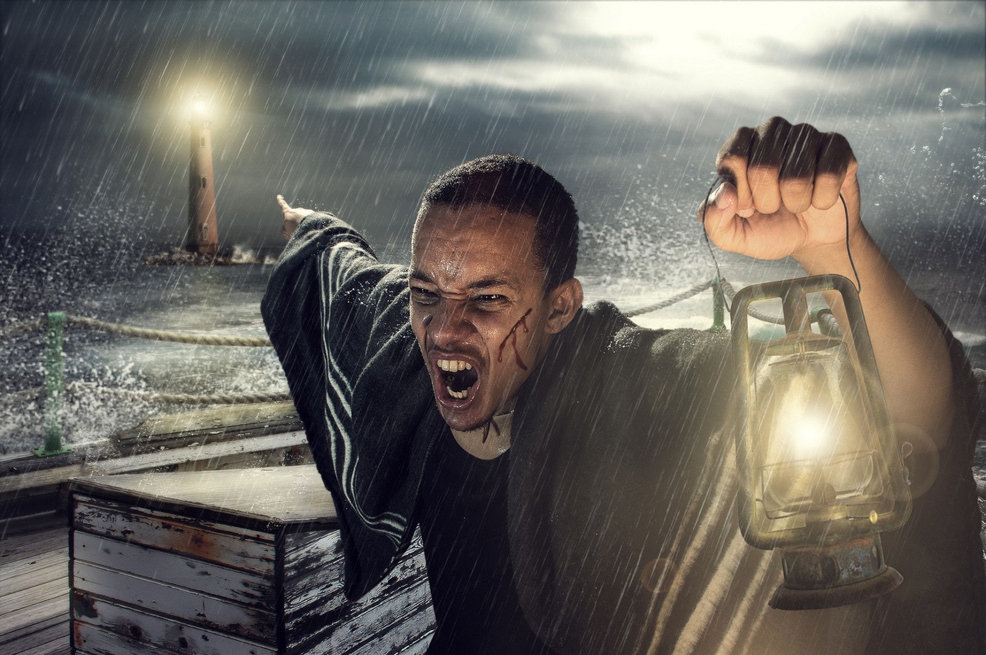 Der sturm. ein mann, der auf einen leuchtturm zeigtDer Sturm. Ein Mann, der auf einen Leuchtturm zeigt