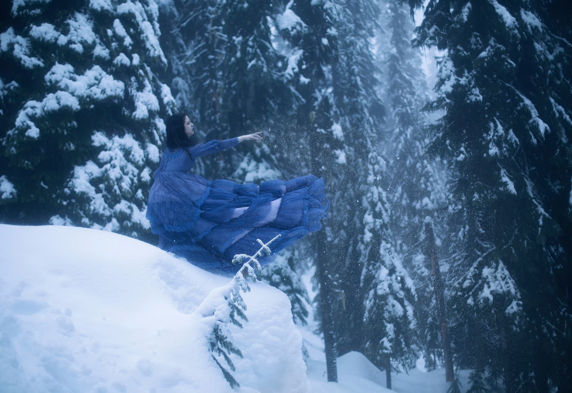 Mädchen im blauen kleid auf dem hintergrund der tannen im schneeMädchen im blauen Kleid auf dem Hintergrund der Tannen im Schnee