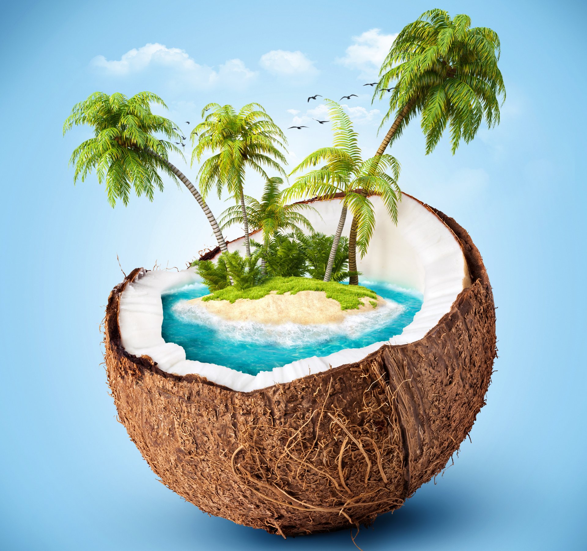 Insel mit Palmen in Kokosnuss