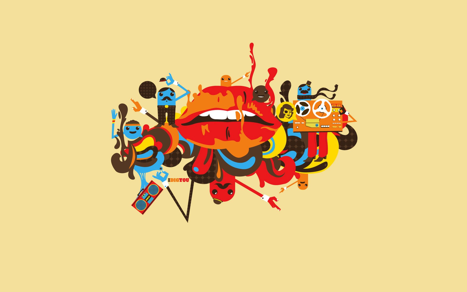 Der gelbe hintergrund zeigt die lippen einer frau und um einen mann aus einem cartoon herum