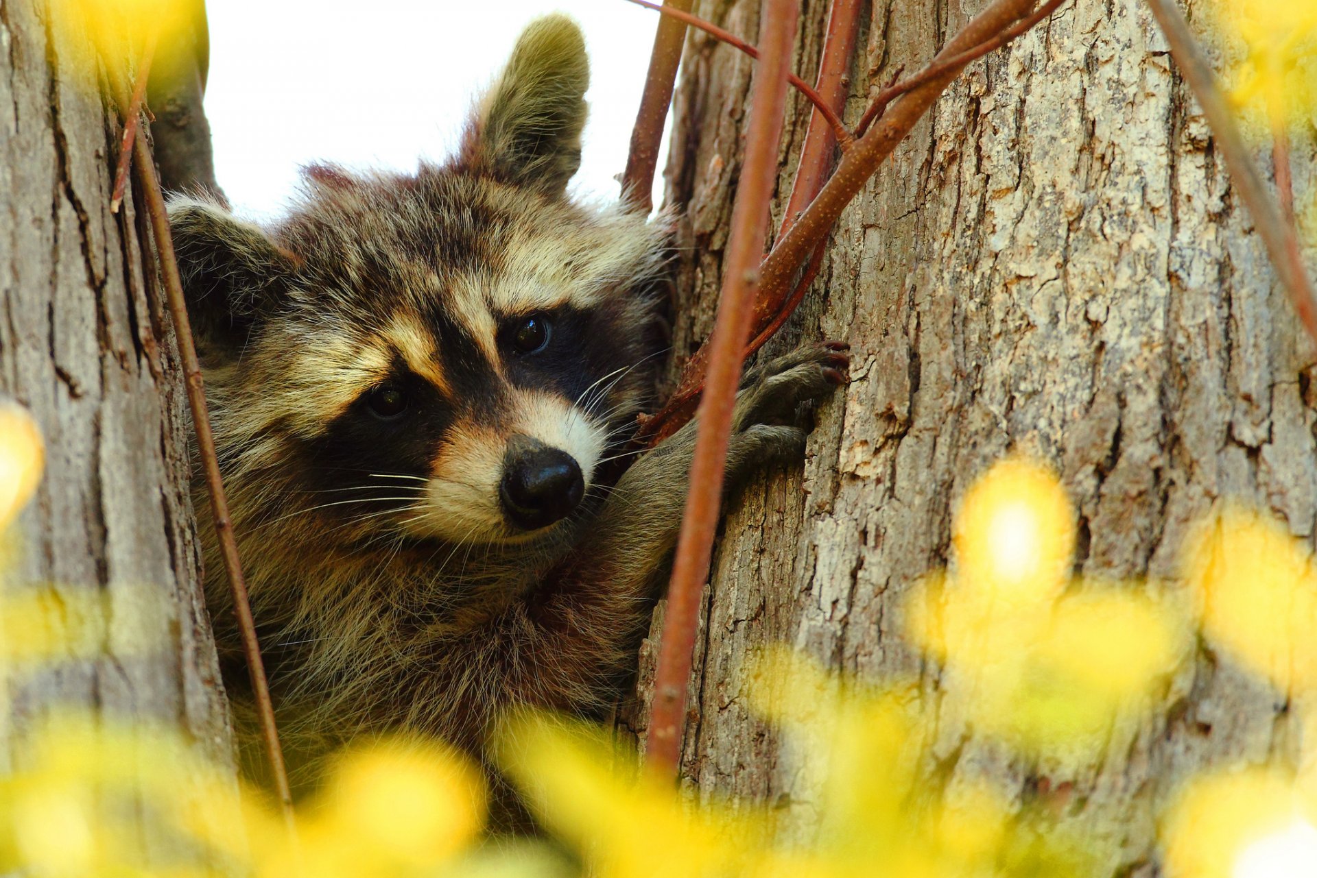 Lustige Waschbärschnauze in den Zweigen eines Baumes