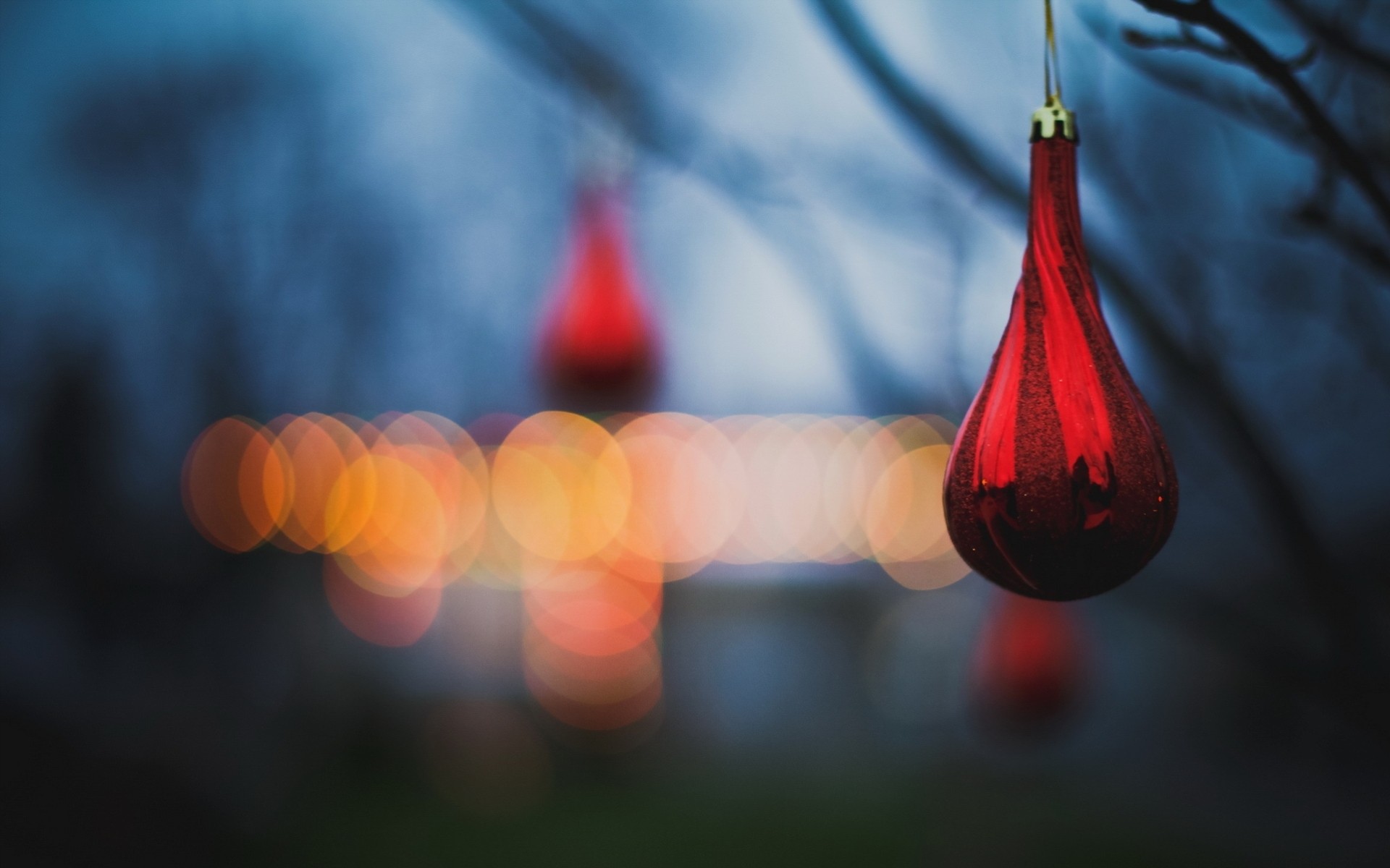 Zwei rote mit goldenen streifen glasspielzeug am weihnachtsbaumZwei rote mit goldenen Streifen Glasspielzeug am Weihnachtsbaum