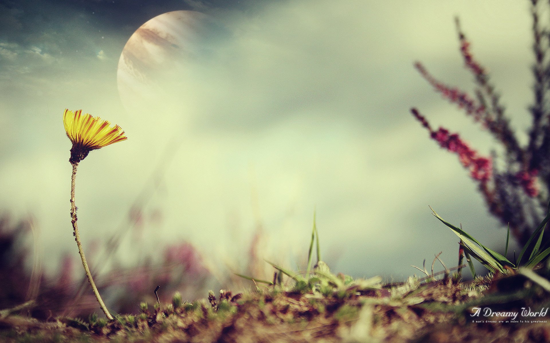 Nahaufnahme mit Löwenzahn, Planeten und Gras