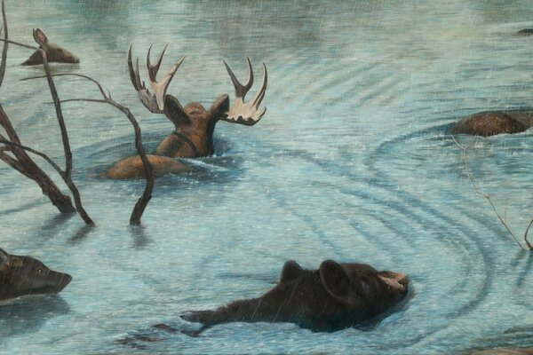Das Mädchen fliegt mit den Tieren zusammen und das Mädchen sitzt
