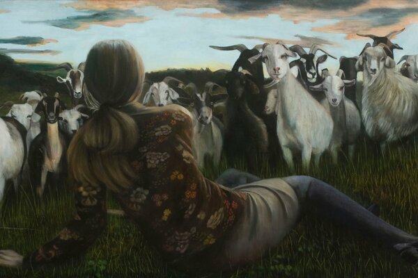 Das Mädchen liegt auf der Wiese und die Schafe, die auf der Wiese grasen, sehen sich gegenseitig an