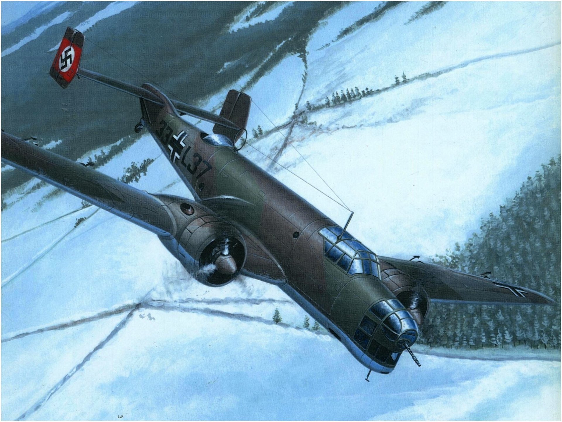 Zeichnung eines deutschen Flugzeugs über einem schneebedeckten Gelände