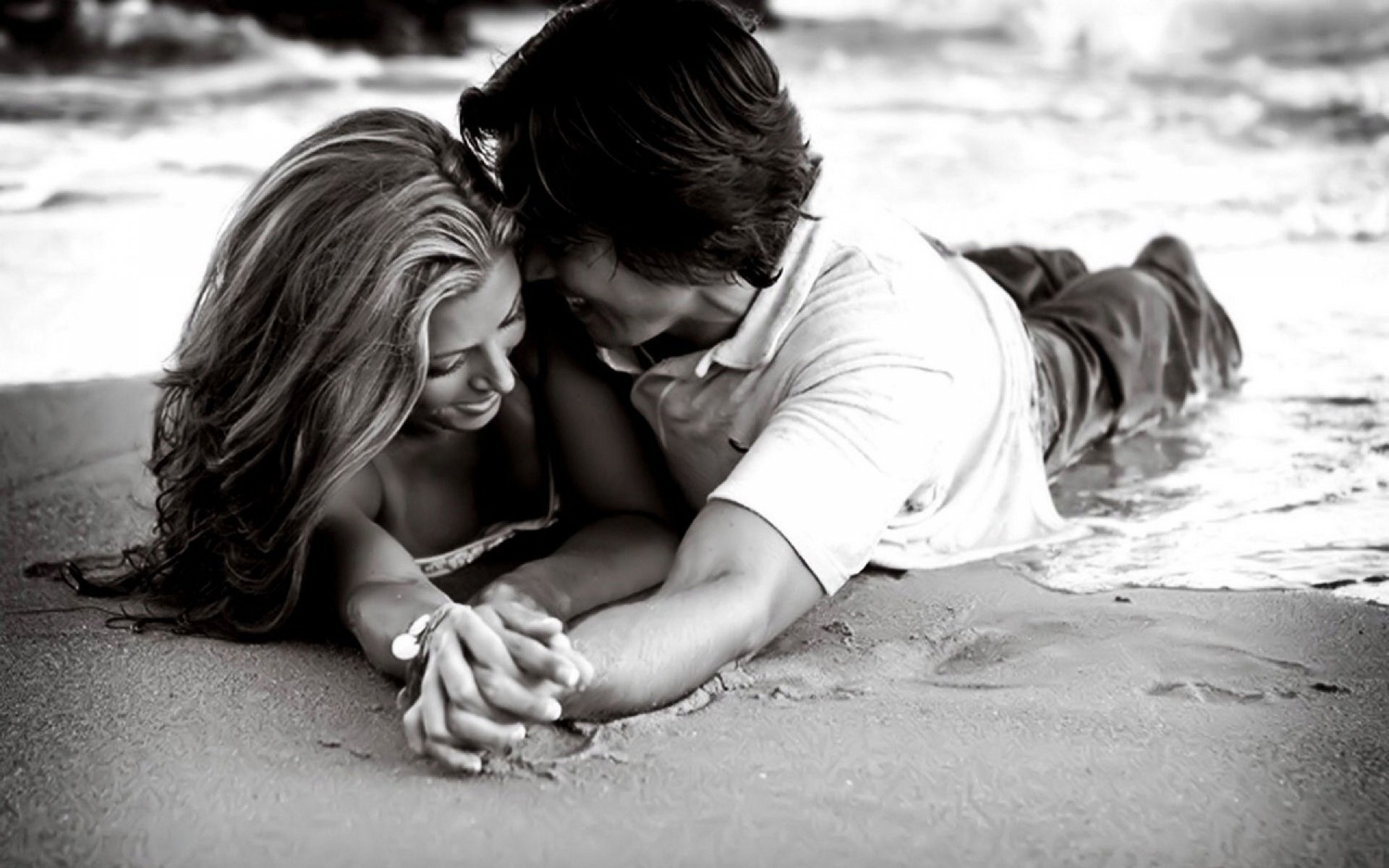 Ein mann und ein mädchen liegen im sand. schwarzweißbildEin Mann und ein Mädchen liegen im Sand. Schwarzweißbild
