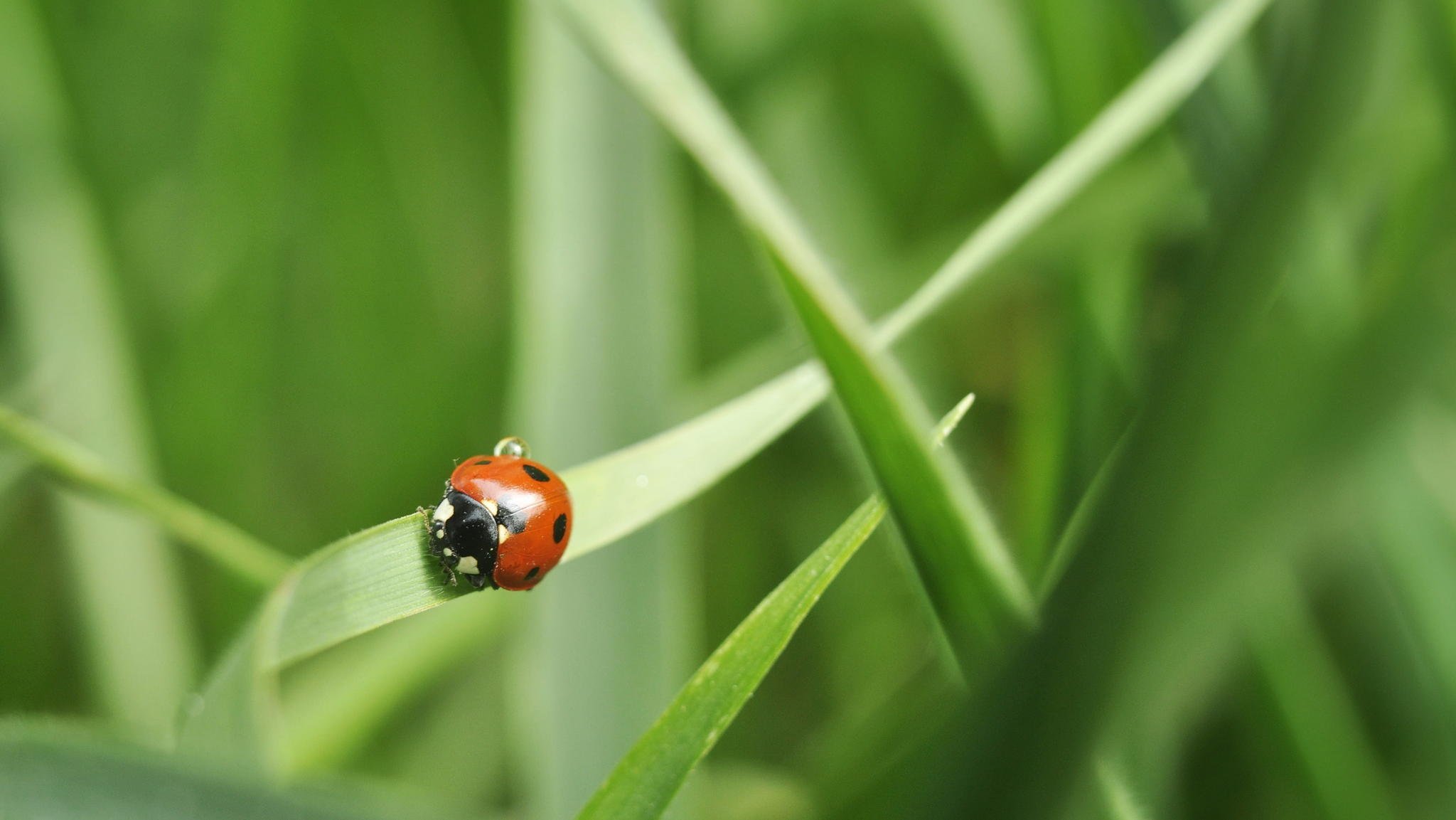 Eine blauäugige katze jagt im gras einen marienkäferEine blauäugige Katze jagt im Gras einen Marienkäfer