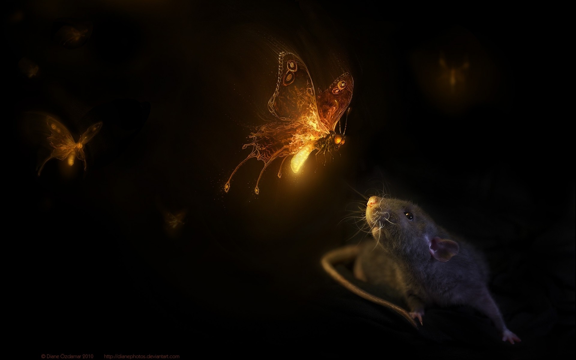 Maus und leuchtende schmetterlinge auf schwarzem hintergrundMaus und leuchtende Schmetterlinge auf schwarzem Hintergrund